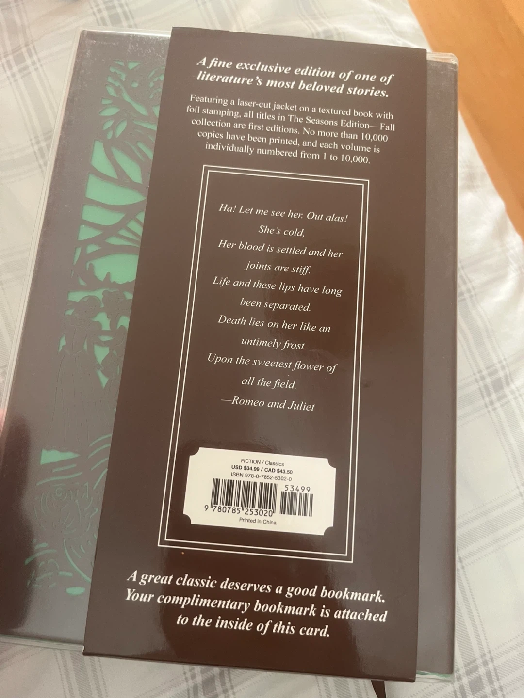 Selling a beautiful edition of Shakespeare in Autumn from the Seasons Edition! This is a fine exclusive edition of one of literature's most beloved stories. The book features a laser-cut jacket on a textured book with foil stamping. It's a great classic and includes a complimentary bookmark attached to the inside of the card