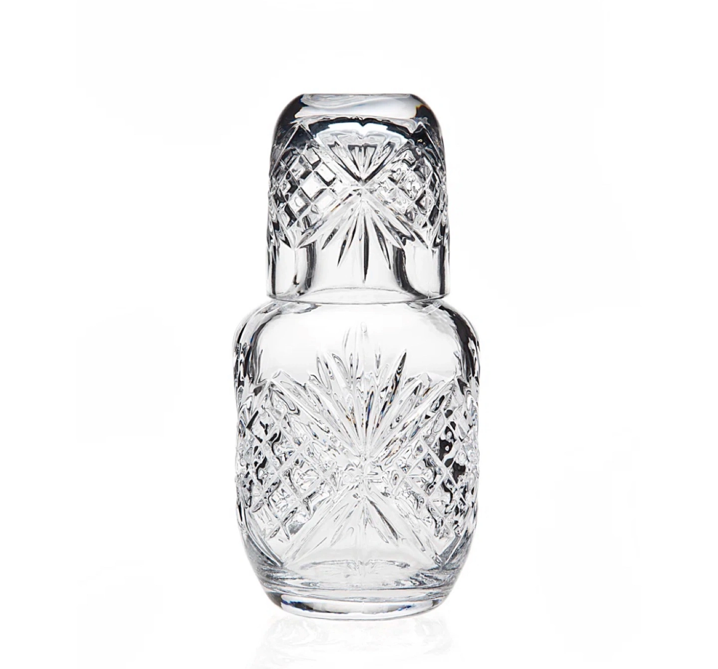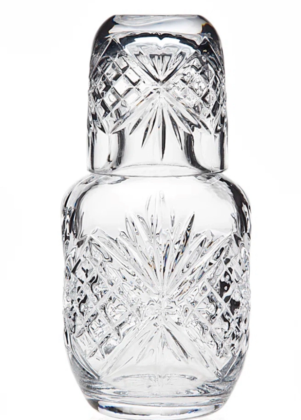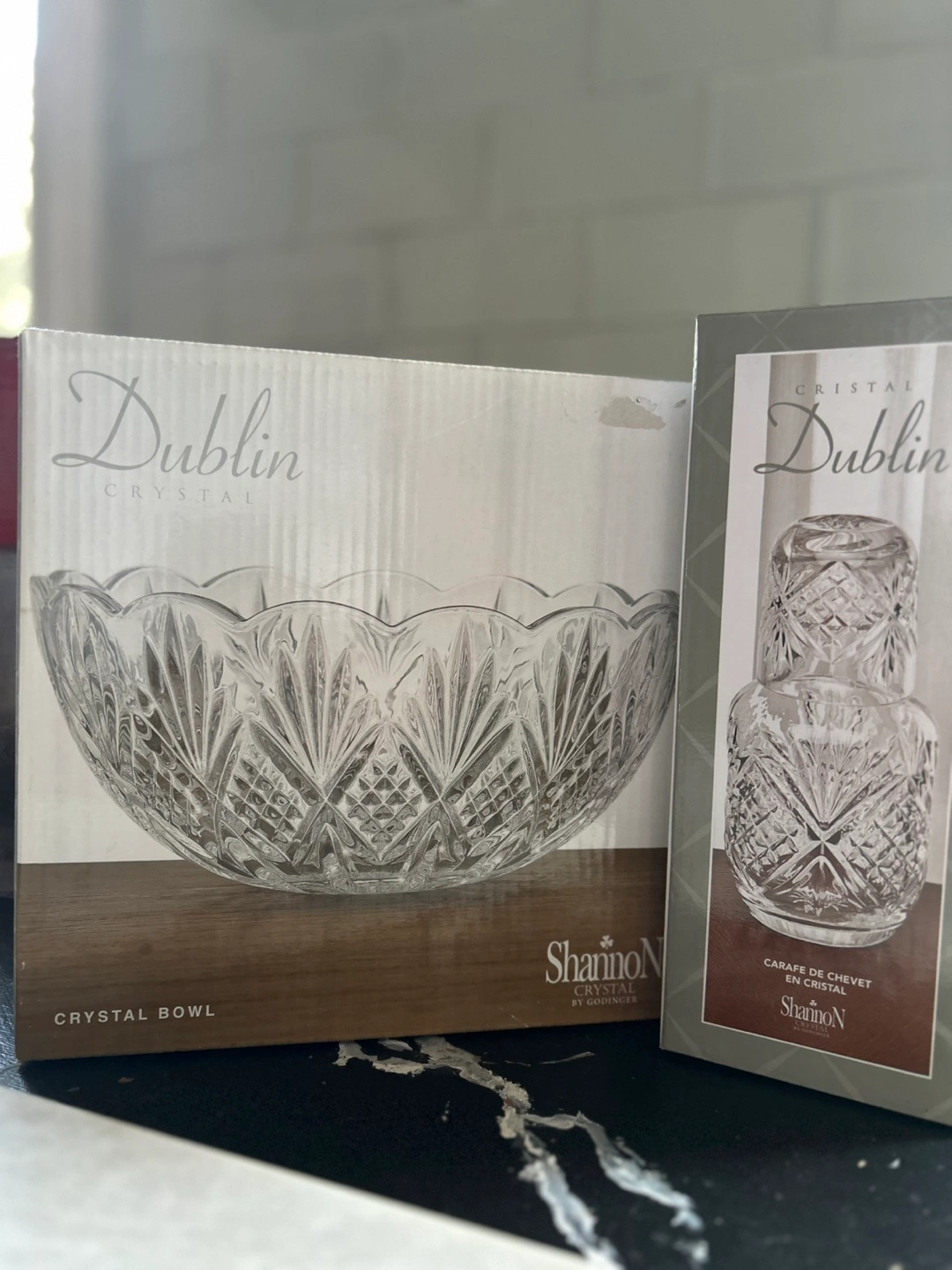 157BNIB BEAUTIFUL DETAILS - Durable clear crystal container and cup & bowl features the Dublin pattern one of Godinger's most sought-after designs. Crystal Container and cup - Dublin. Carafe Capacity - 16 oz.. Cup Capacity - 4.5 oz.. 💎Crafted of quality crystal material. 💎Tumbler used as a lid to keep water clean. 💎Dishwasher safe Makes a great housewarming gift or keep this stunning cut crystal set for yourself and live in elegance and luxury