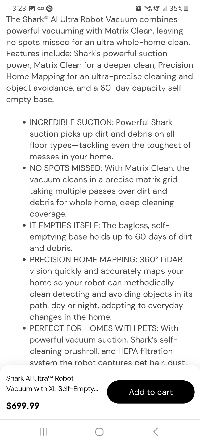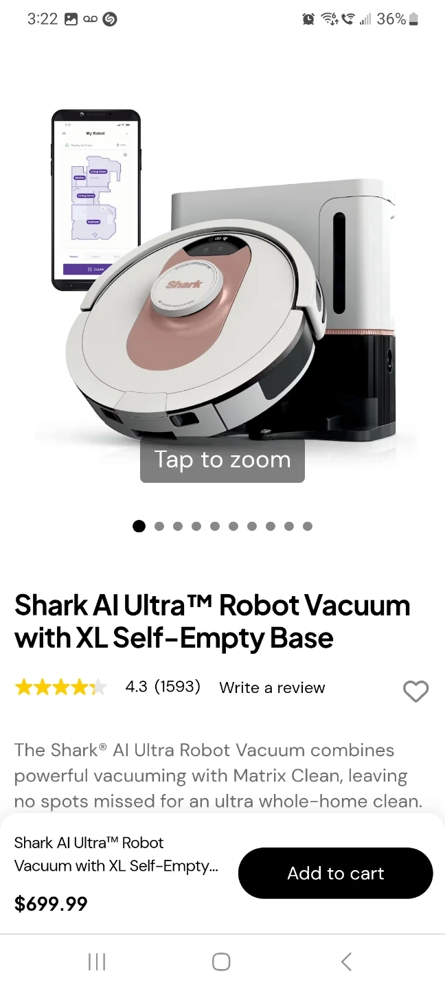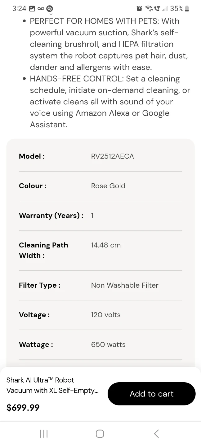 10Looking to sell a Shark AI Ultra Robot Vacuum with XL Self-Empty Base. This powerful vacuum combines powerful vacuuming with Matrix Clean, leaving no spots missed for an ultra whole-home clean. Key features include Shark's powerful suction power, Matrix Clean for a deeper clean, Precision Home Mapping for an ultra-precise cleaning and object avoidance, and a 60-day capacity self-empty base. Model number is RV2512AECA. The colour is Rose Gold. It has a cleaning path width of 14.48 cm, and the filter type is a non-washable filter. It operates at 120 volts and 650 watts. Originally bought for $699.99..$275