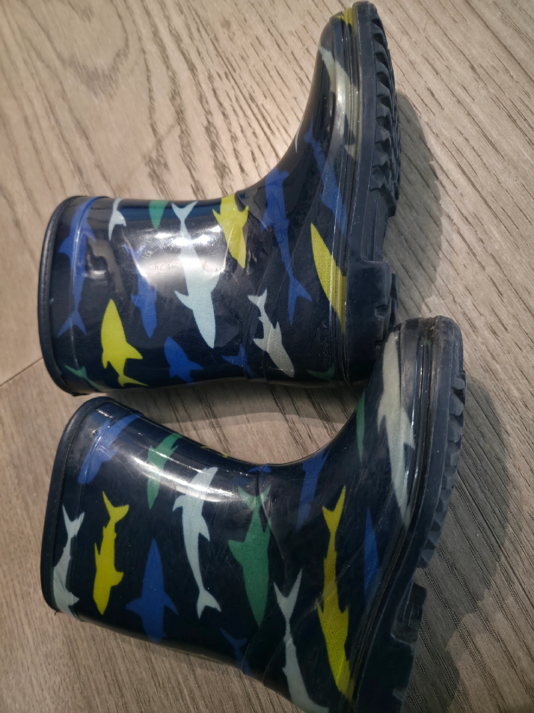 81Cute pair of rain boots with a fun shark pattern! These are in great condition and ready for some puddle jumping. Size 9.