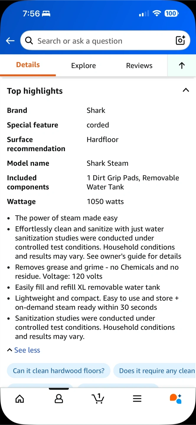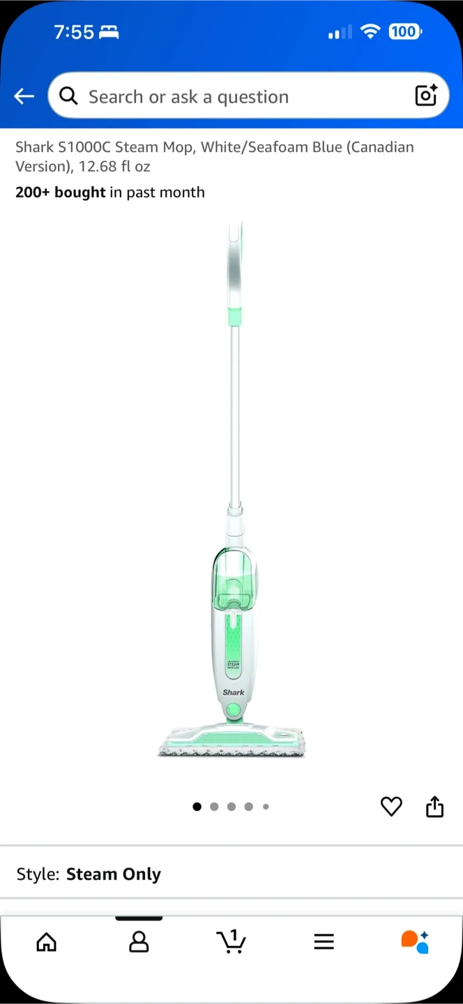 64Keep your hard floors sparkling clean with this Shark S1000C Steam Mop! It's white and seafoam blue, and super easy to use. Key features: - Corded - Designed for hard floors - Includes 1 Dirt Grip Pad and a removable water tank - 1050 watts It's lightweight and compact, making it easy to store and use. Plus, it heats up quickly, so you can start steaming in no time! Bought this at the last Amazon Prime day. Somehow I ended up with two. Hoping to get back 75% of what I paid.