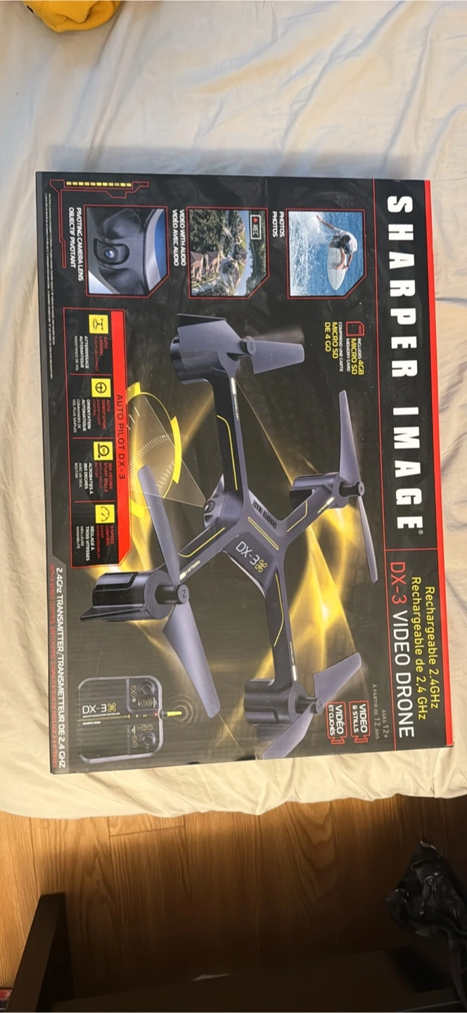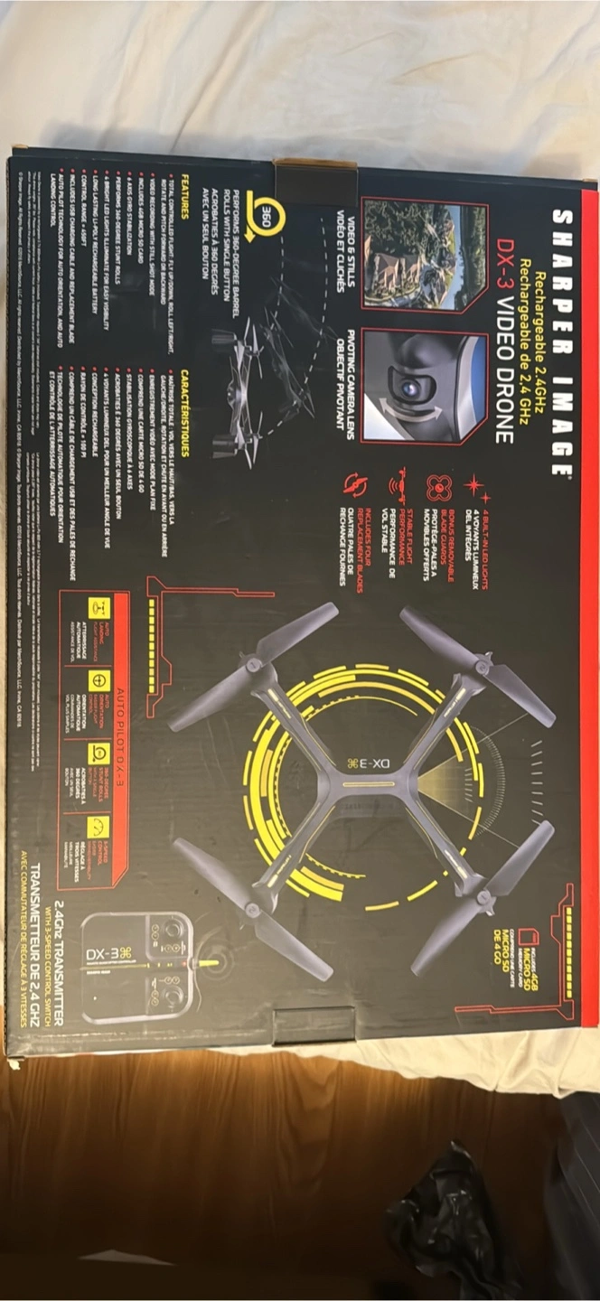 New Sharper Image DX-3 video drone. 2.4 GHz rechargeable drone. Features auto pilot and video stills. Includes transmitter.