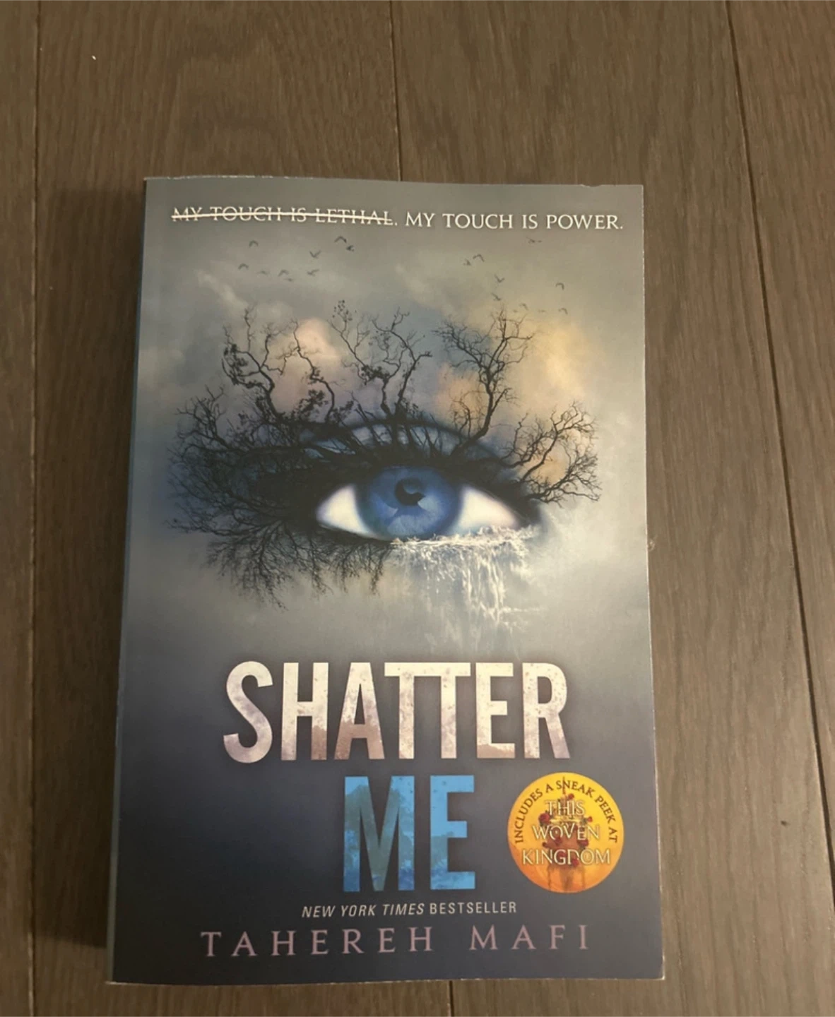 10Selling a copy of Shatter Me by Tahereh Mafi! It's a New York Times Bestseller. The cover says, 'My touch is lethal. My touch is power.' It also includes a sneak peek at The Woven Kingdom