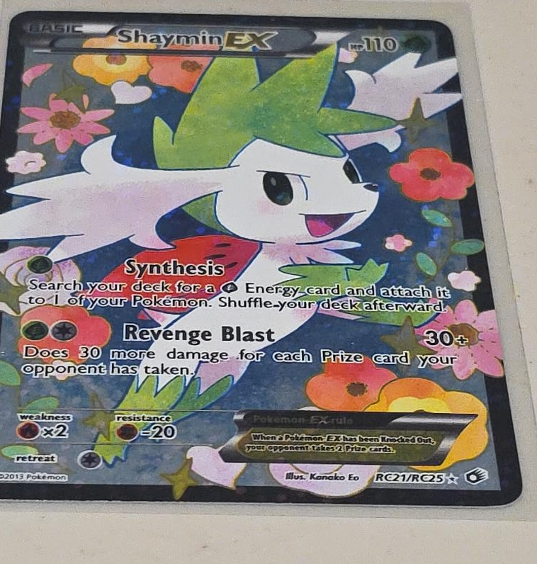 Selling a Shaymin EX Pokemon card. It has the Synthesis and Revenge Blast moves. The card's weakness is x2 and its resistance is -20. Illus. Kanako Eo, RC21/RC25