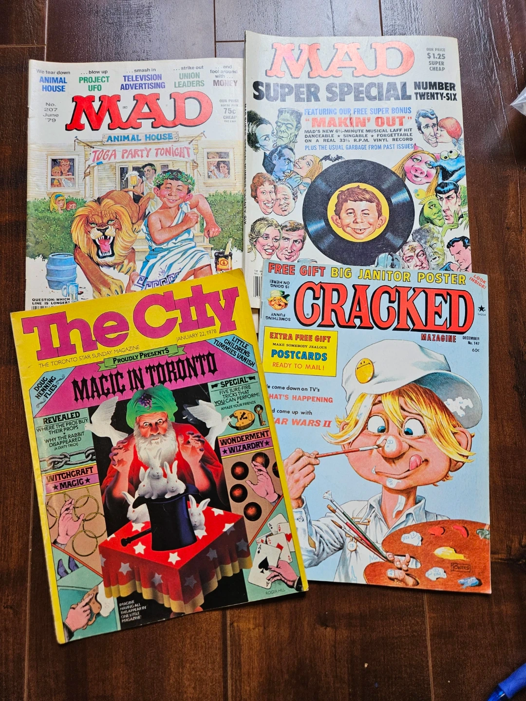 This is MAD Super Special Number Twenty-Six. It features a free Super Bonus titled "Makin' Out" which includes a 6 1/2-minute musical Laff hit on a 33 1/3 R.P.M. vinyl record. It also includes a free gift Big Janitor Poster and postcards ready to mail.