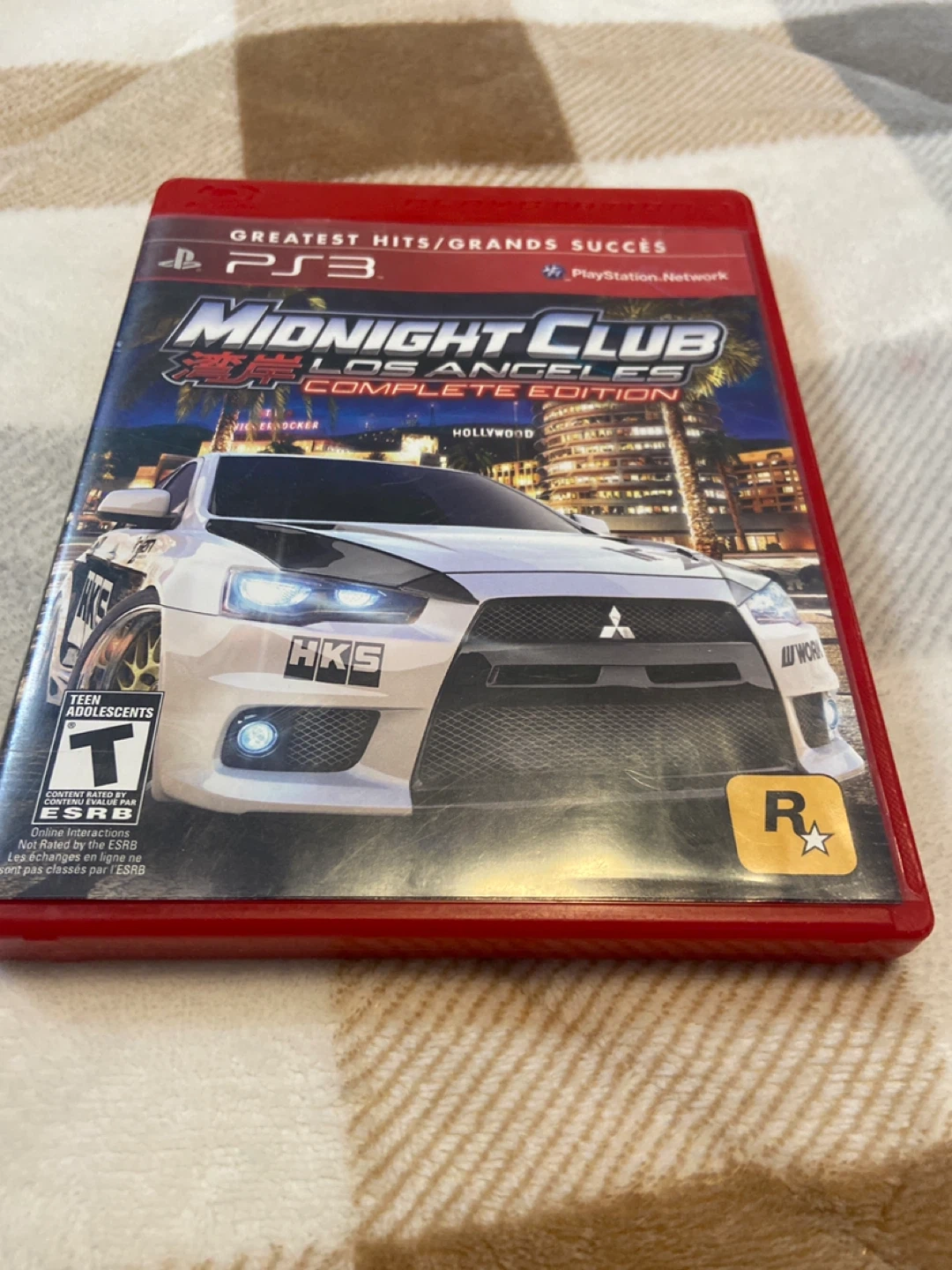 This is the "Greatest Hits" version of Midnight Club: Los Angeles Complete Edition for PlayStation 3. It's rated T for Teen. The game includes online interactions. It comes with the original case and disc. Rockstar Games.