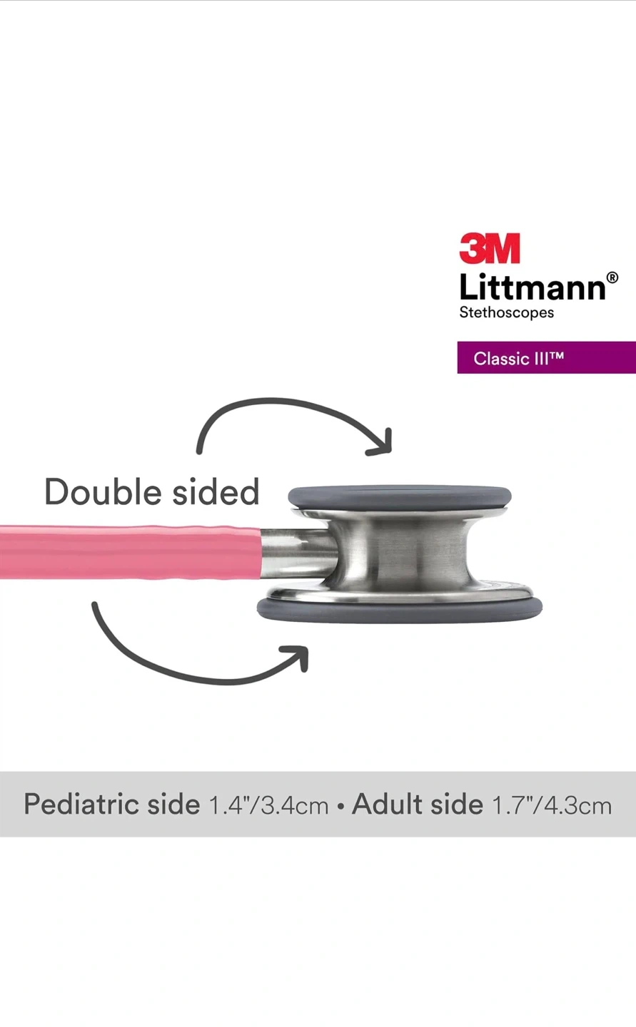 Open box 3M Littmann Classic III stethoscope in pearl pink. It's double-sided with a pediatric side measuring 1.4"/3.4cm and an adult side measuring 1.7"/4.3cm. This stethoscope is designed for monitoring and assessing a wide range of patients.