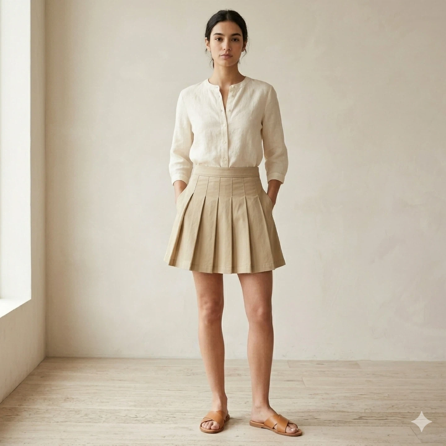 A classic pleated mini skirt in a versatile cream shade. Features functional side pockets and a structured, flattering fit. Made from a durable cotton blend fabric. Perfect for pairing with boots or sneakers.