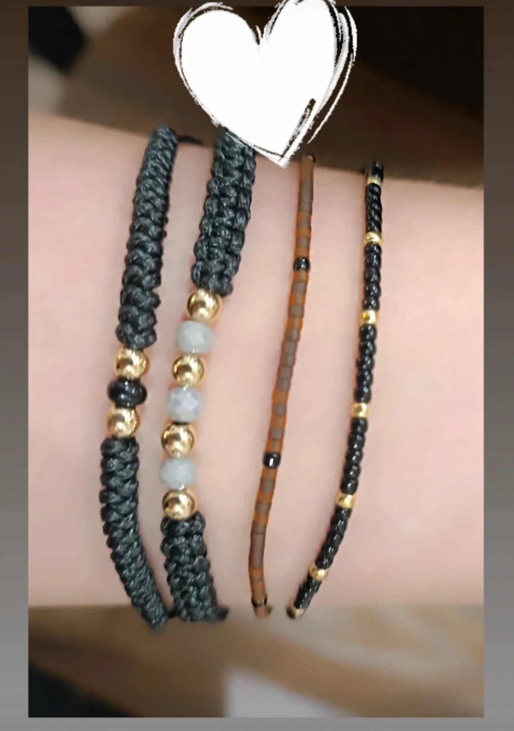 Selling a set of four unique beaded bracelets! Two feature a braided black cord with gold, black and grey beads, another is a slim brown beaded strand, and the fourth is a black beaded strand with gold accents. They're perfect for stacking or wearing individually