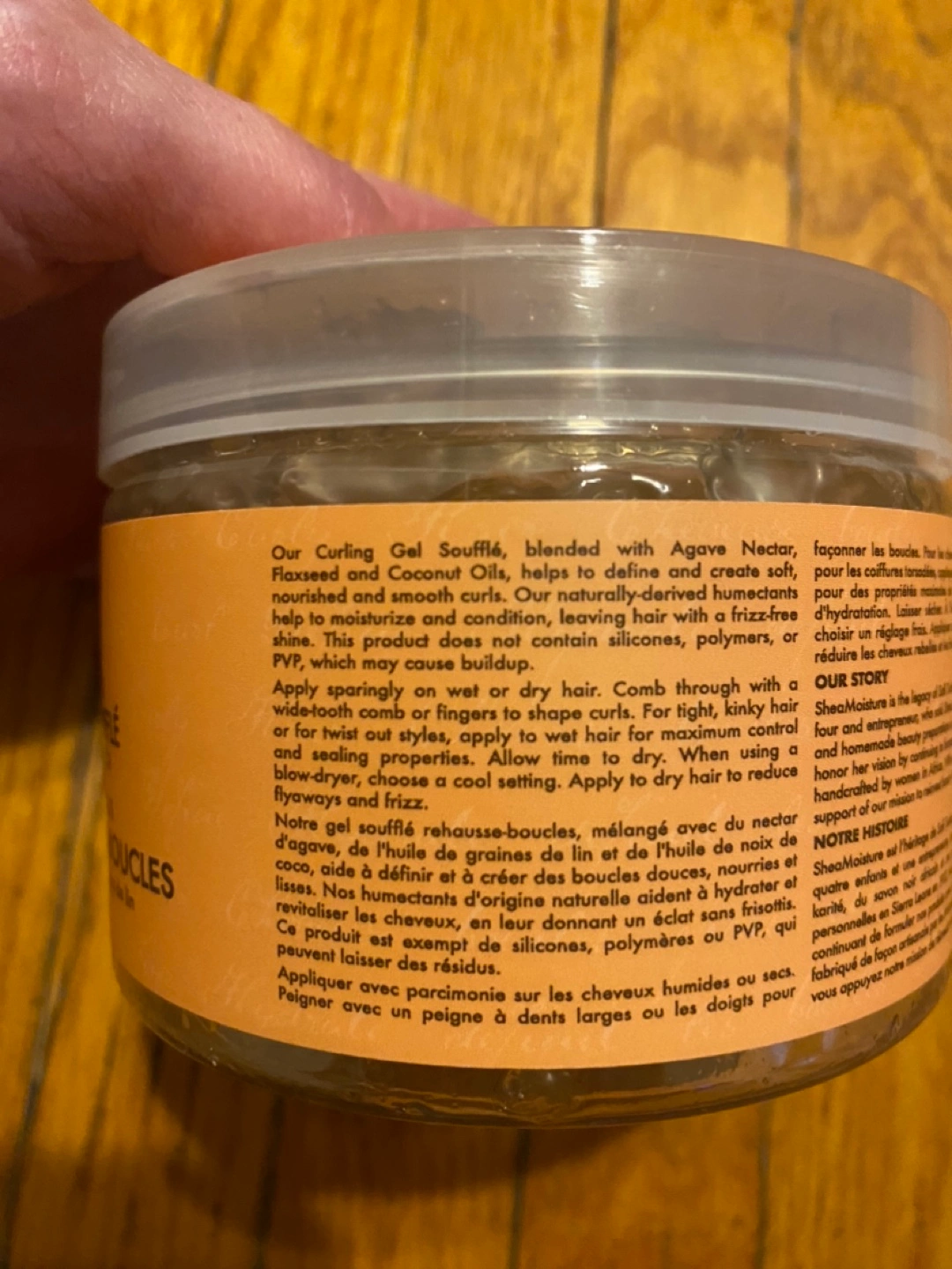 Curling gel soufflé for thick, curly hair. Contains agave nectar and flaxseed oil. Moisturizes and defines curls. Color safe. Used only once. Retails for $15. Pick up only, no delivery.
