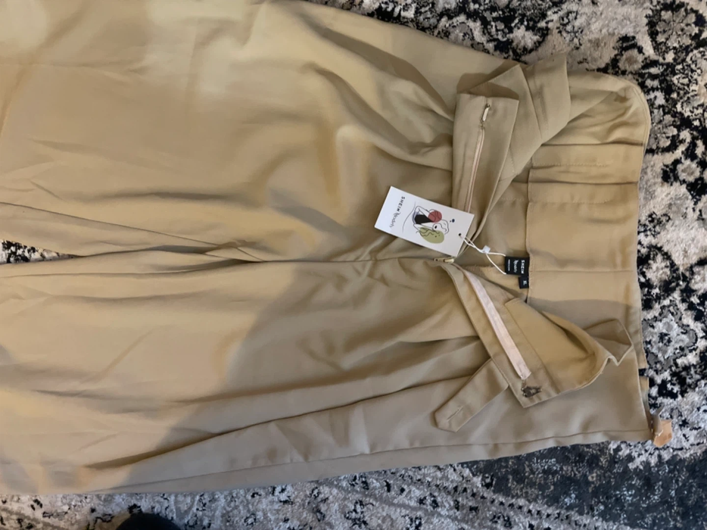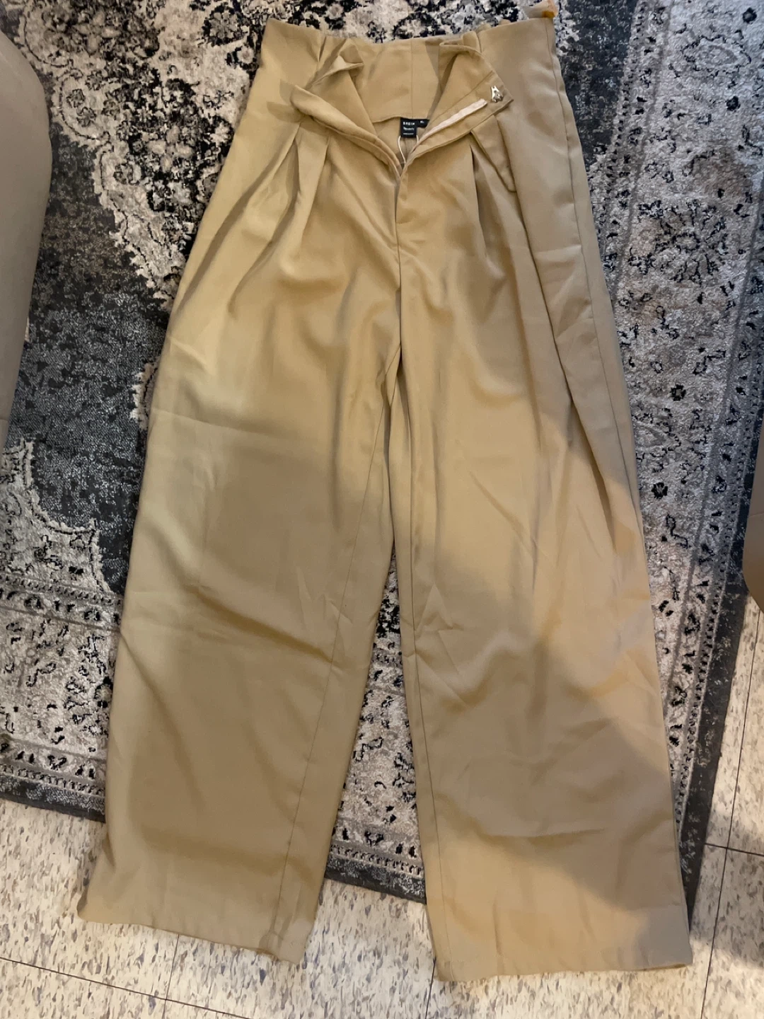 These are a pair of SHEIN beige wide leg pleated pants in size xl They're in great condition and ready for a new home. Missing button. Easy fix