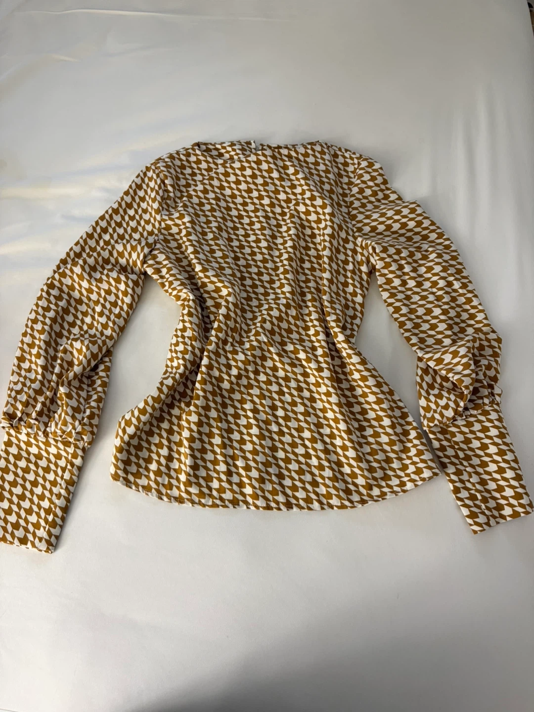 344Selling a Shein blouse in size M. It has a unique brown and white pattern. It's in great condition and ready for a new home
