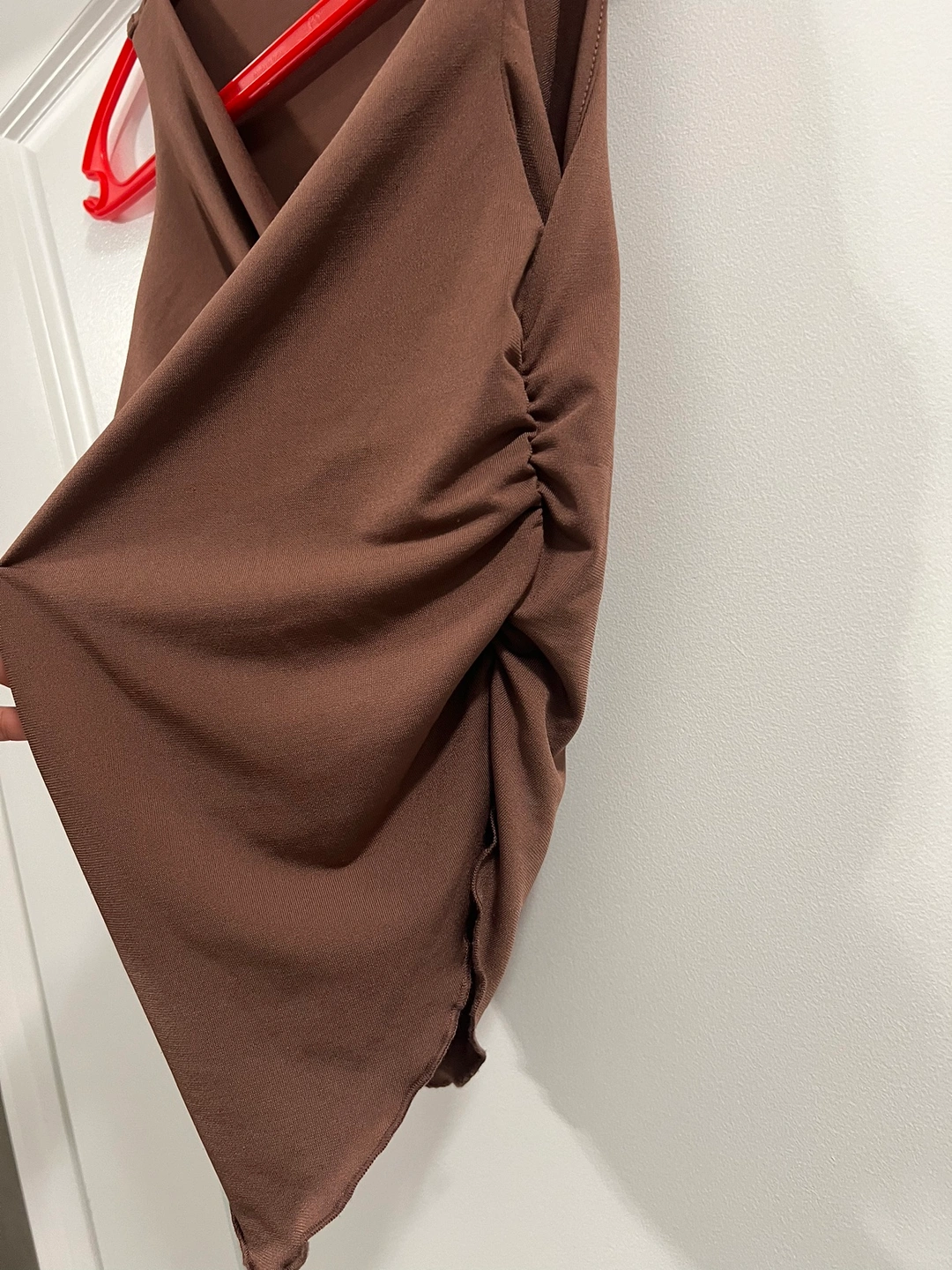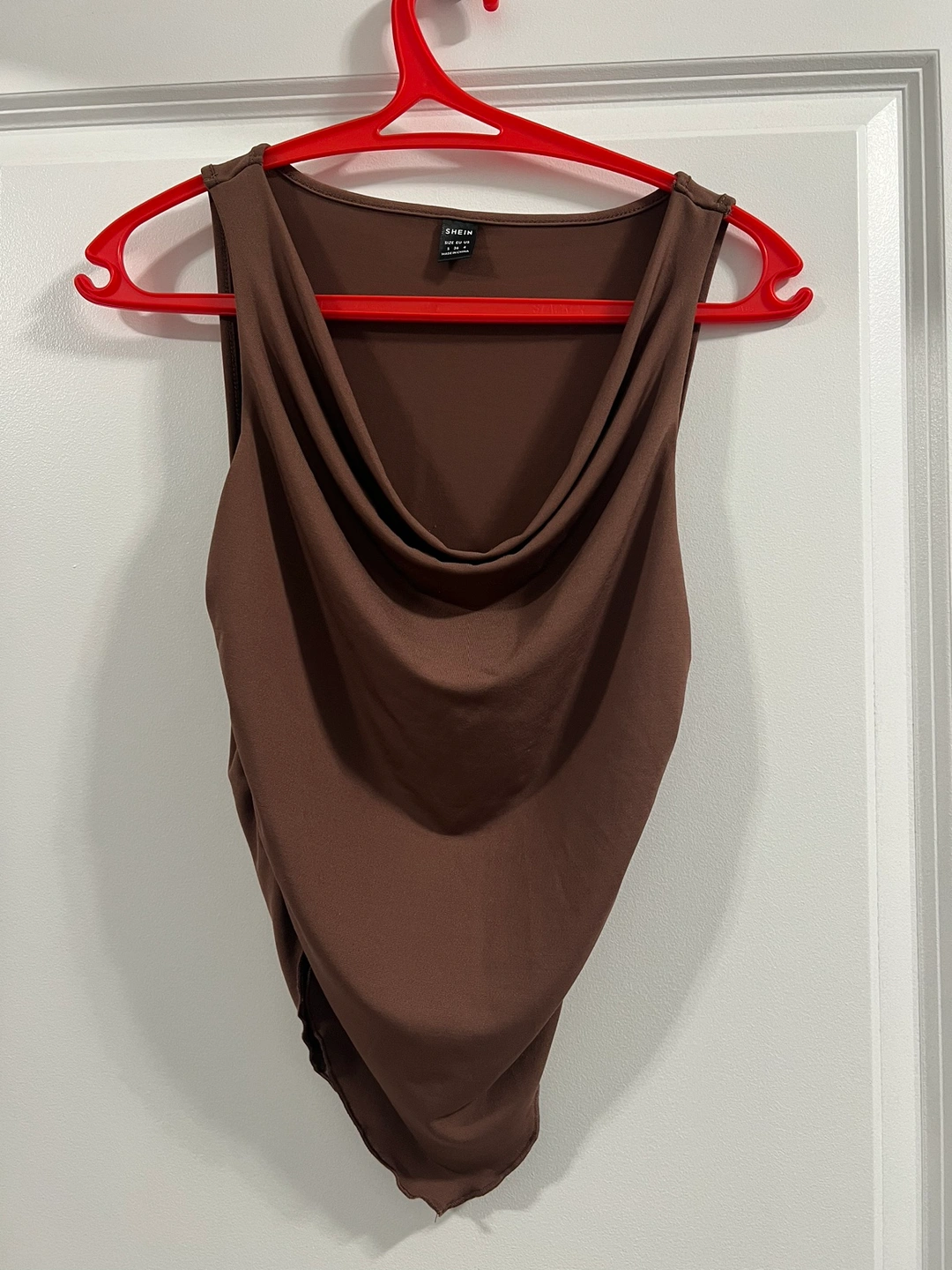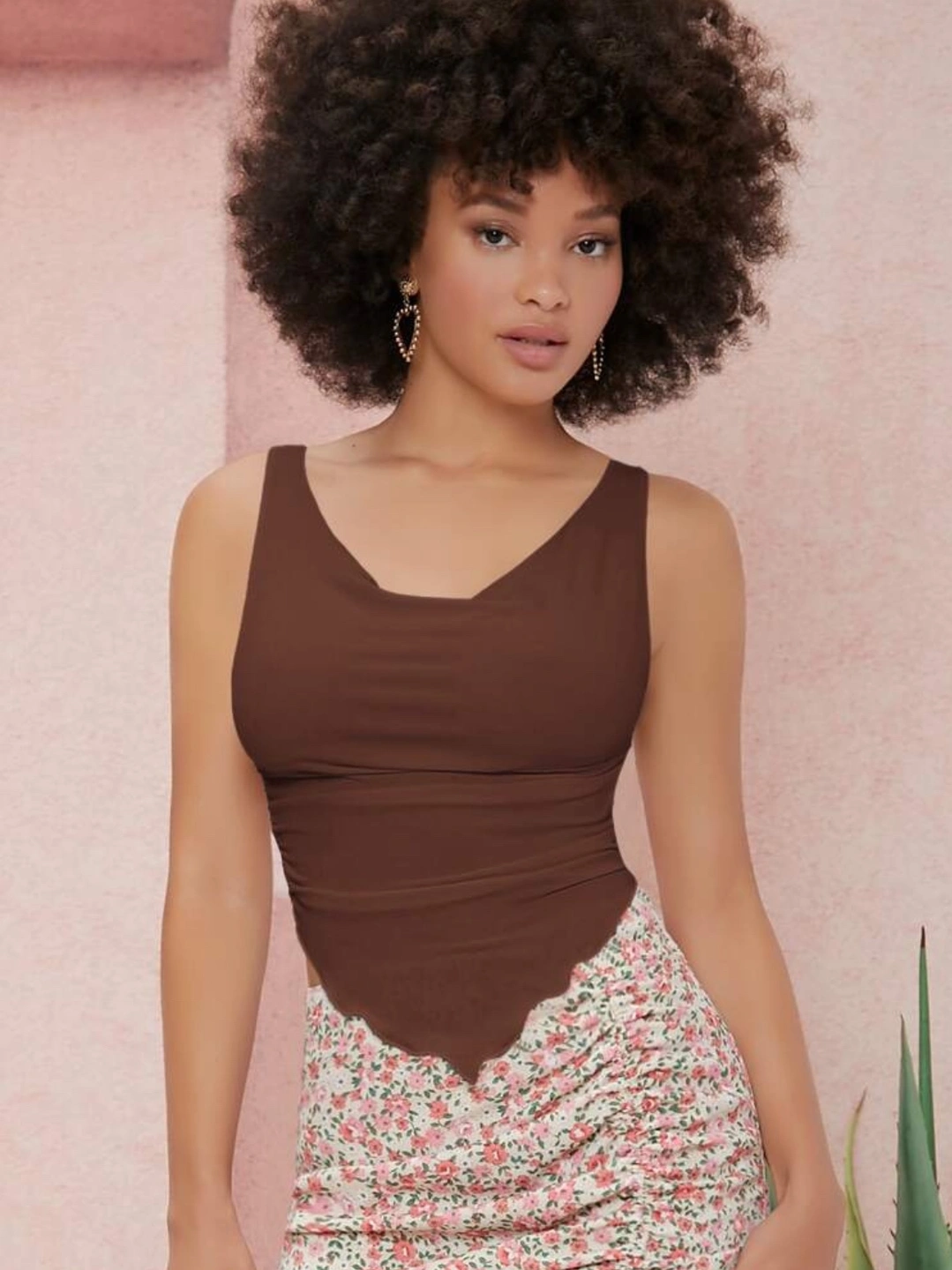 Size S, The top is made from a stretchy, comfortable fabric. It features a cowl neck, sleeveless design, and a loose fit. It is perfect for casual wear, under blazer etc