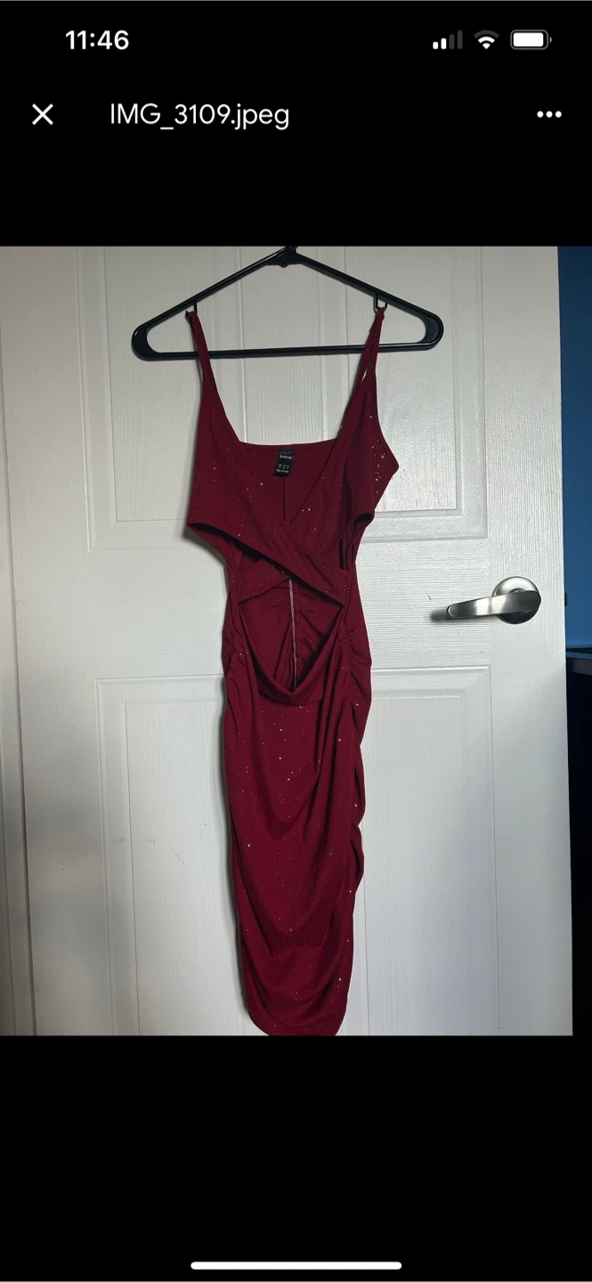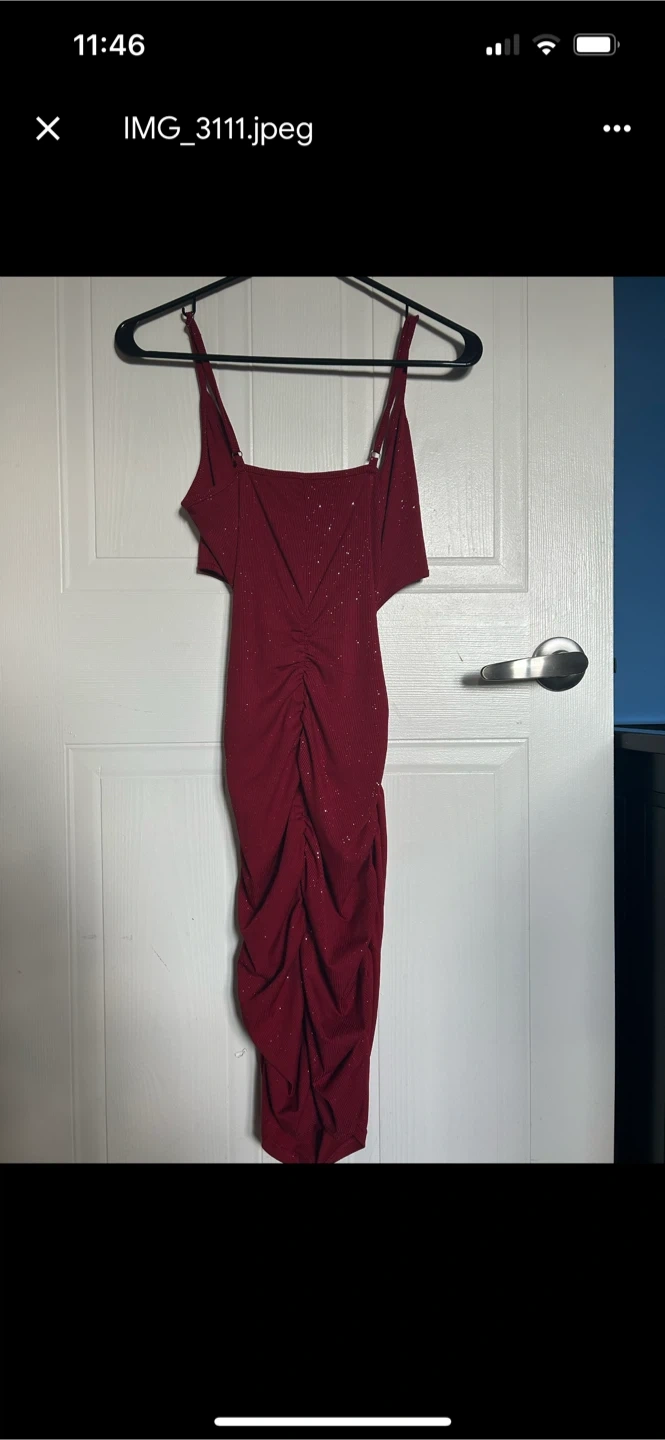 Selling a cute burgundy dress from Shein! It's a size small and in great condition. The dress has a unique design with a cutout and ruched detailing. Perfect for a night out!