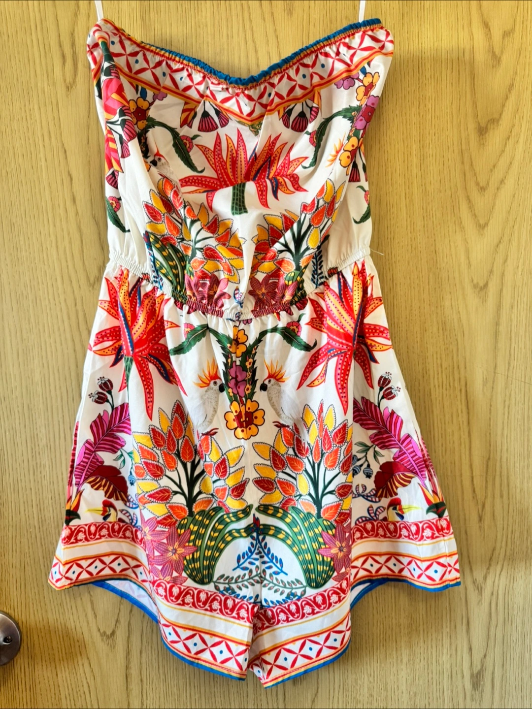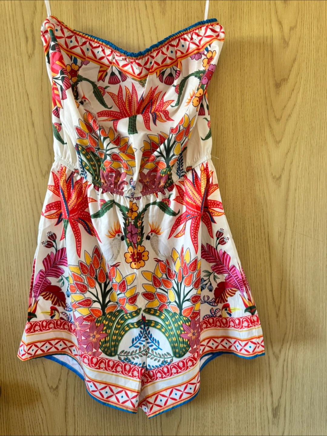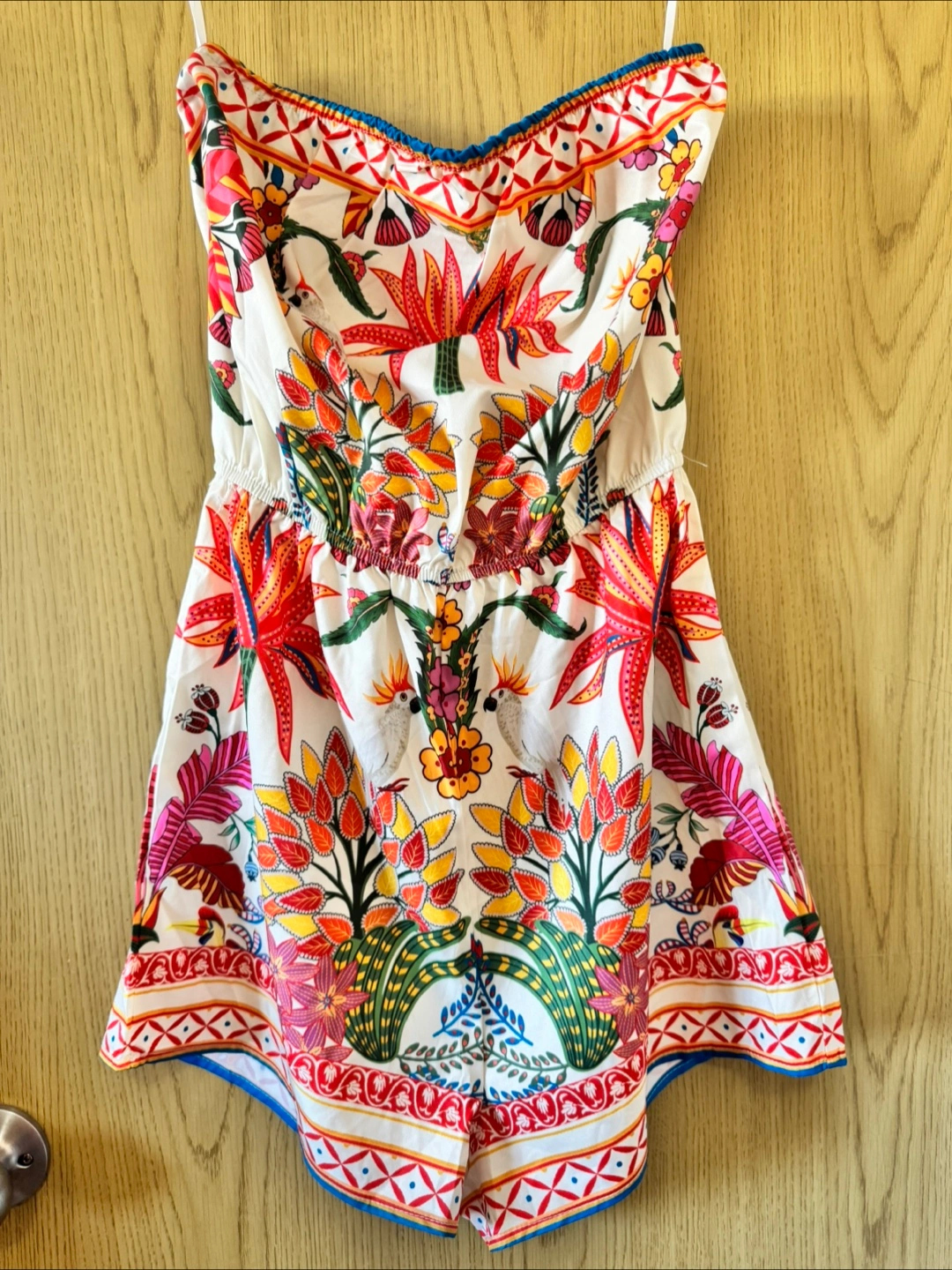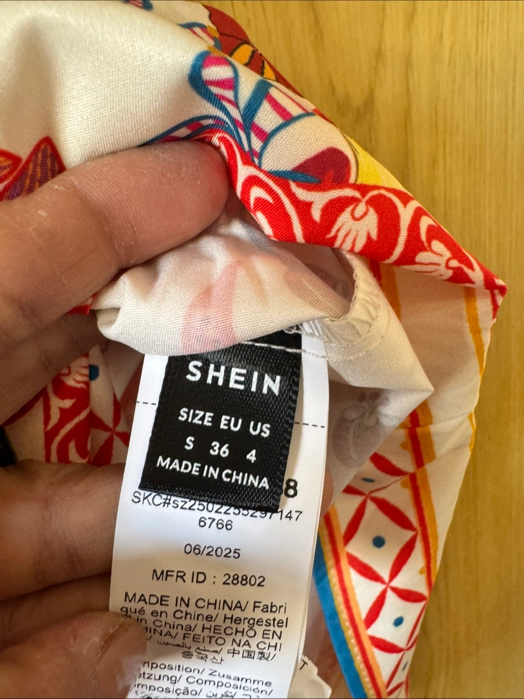 I'm selling a cute Shein romper with a colourful floral print. It's a size small (S). The tag indicates it's a size EU 36, US 4. The material is lightweight and perfect for summer!