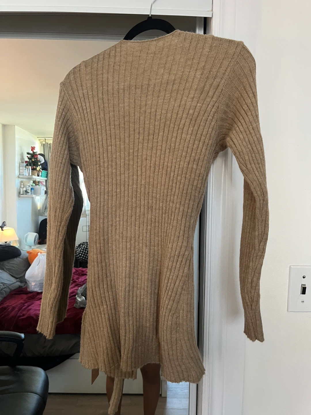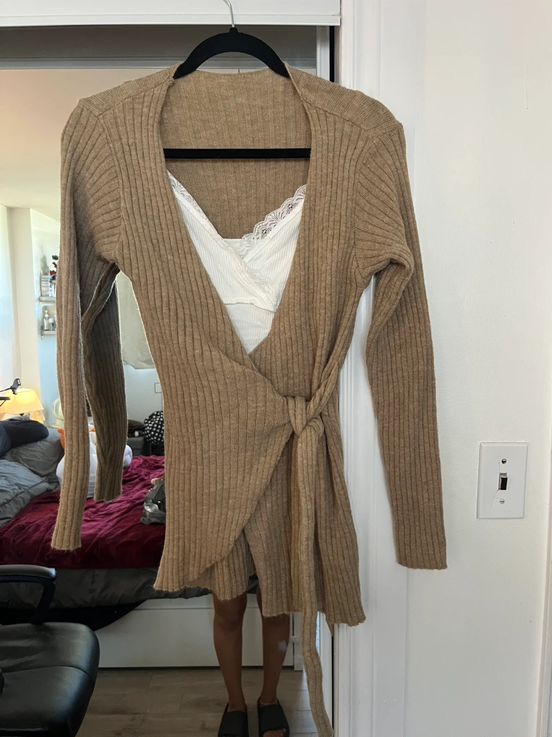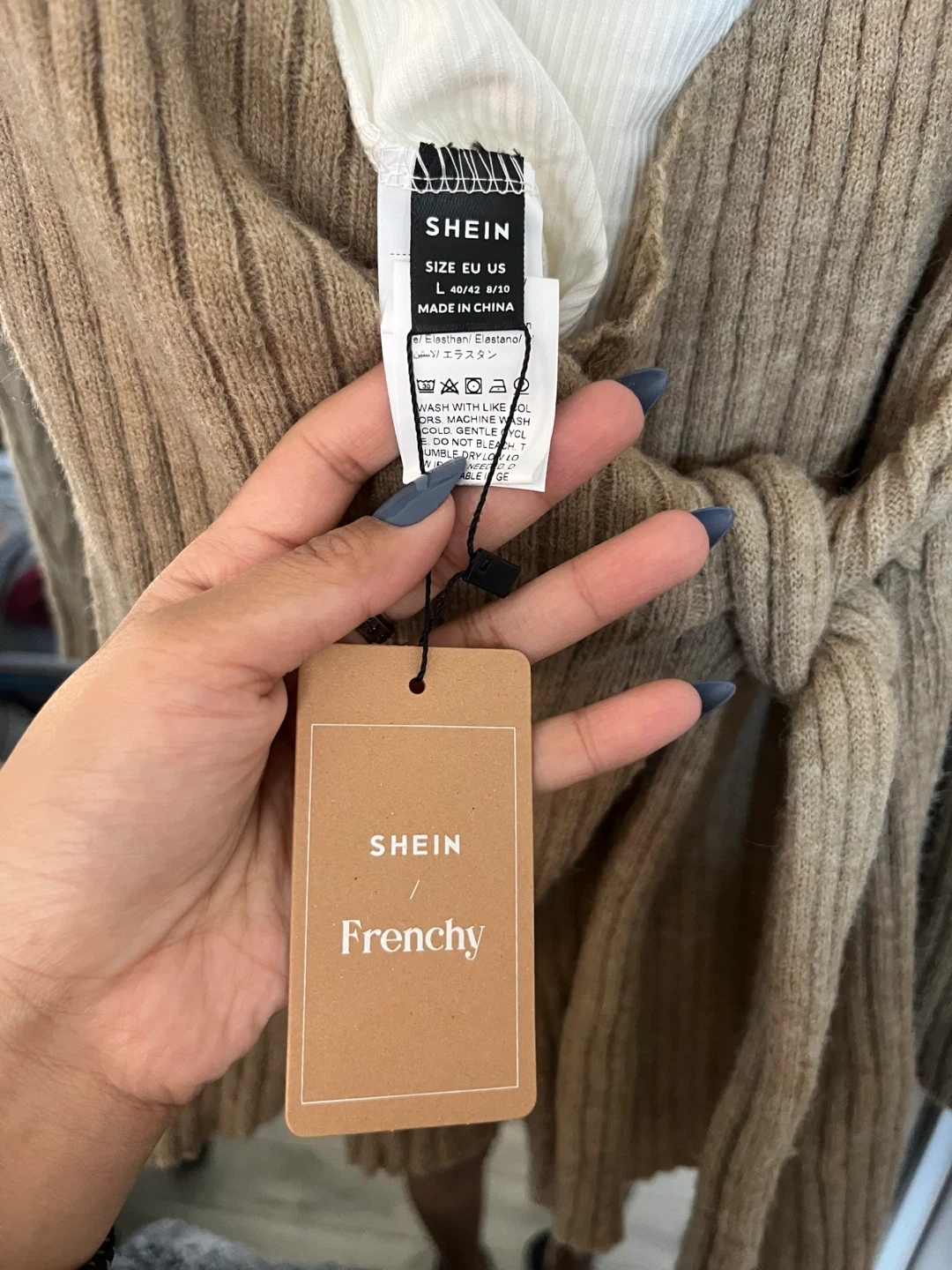 77Selling a Shein Frenchy cardigan in size L. It's a beautiful neutral beige colour and has a tie at the waist. Included is the white lace top inside! Perfect for layering or wearing on its own for fall fashion!