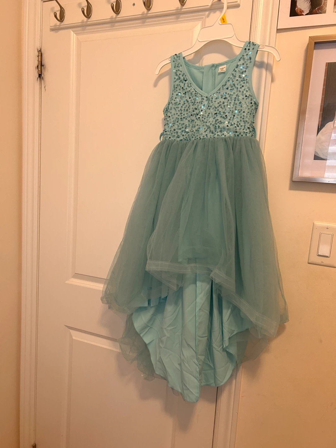 239A lovely blue dress from Shein, perfect for your little one! The dress is a size 8Y and features a beautiful sequined bodice and a flowing tulle skirt. It is brand new. Never worn, it was too tight for my daughter!!!!