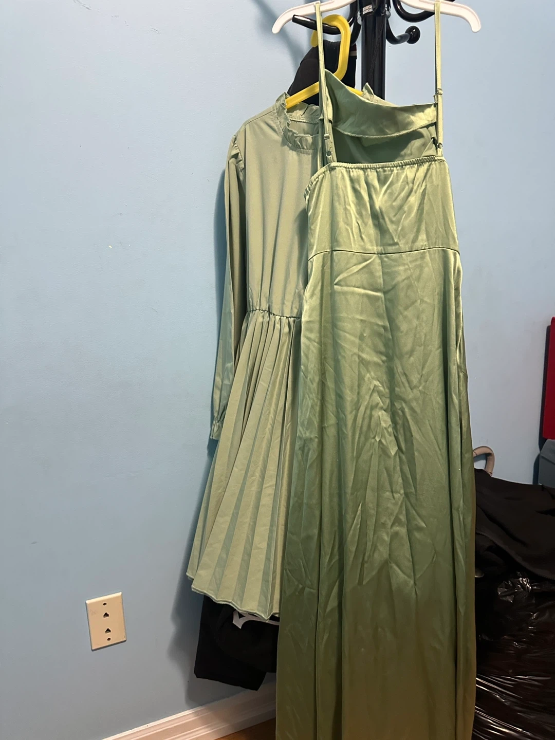 23Two lovely green dresses from Shein! One is a satin-like slip dress, and the other is a long-sleeved dress with a ruffled collar. Both are in great condition and ready for a new home. Size information is available on the Shein website