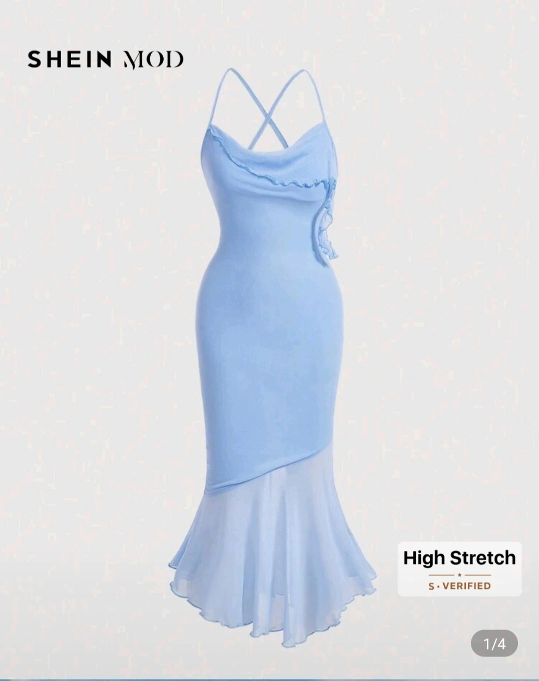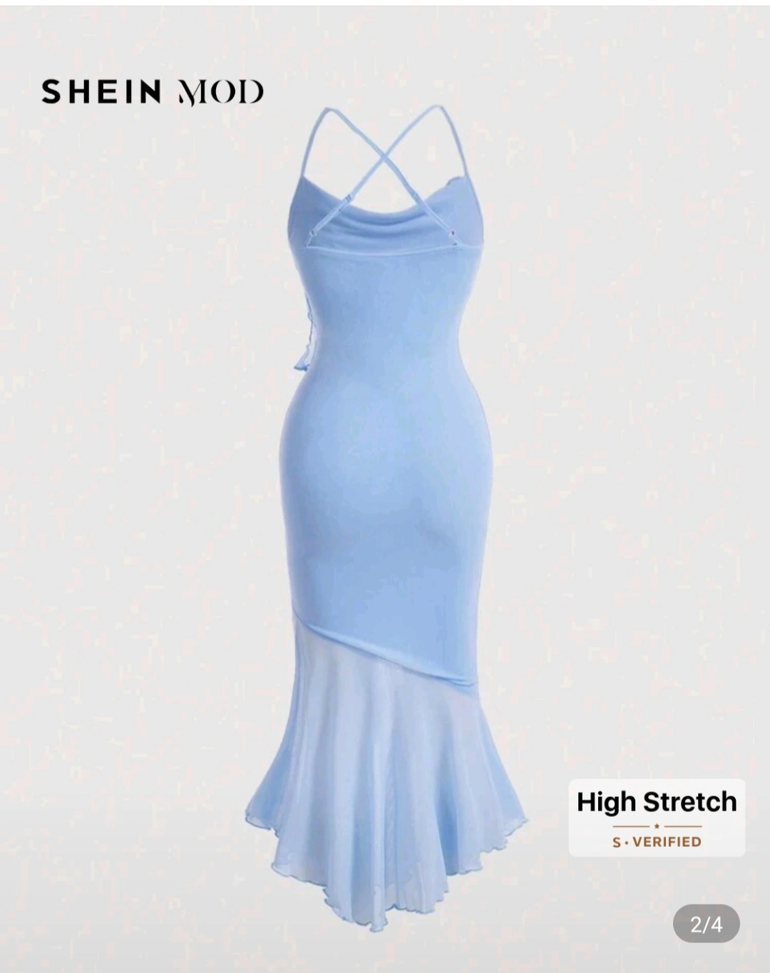 73Stunning light blue midi dress. Features a cowl neck, criss-cross straps, and a beautiful mermaid hemline. High stretch material. Perfect for a special occasion. I worned it once.