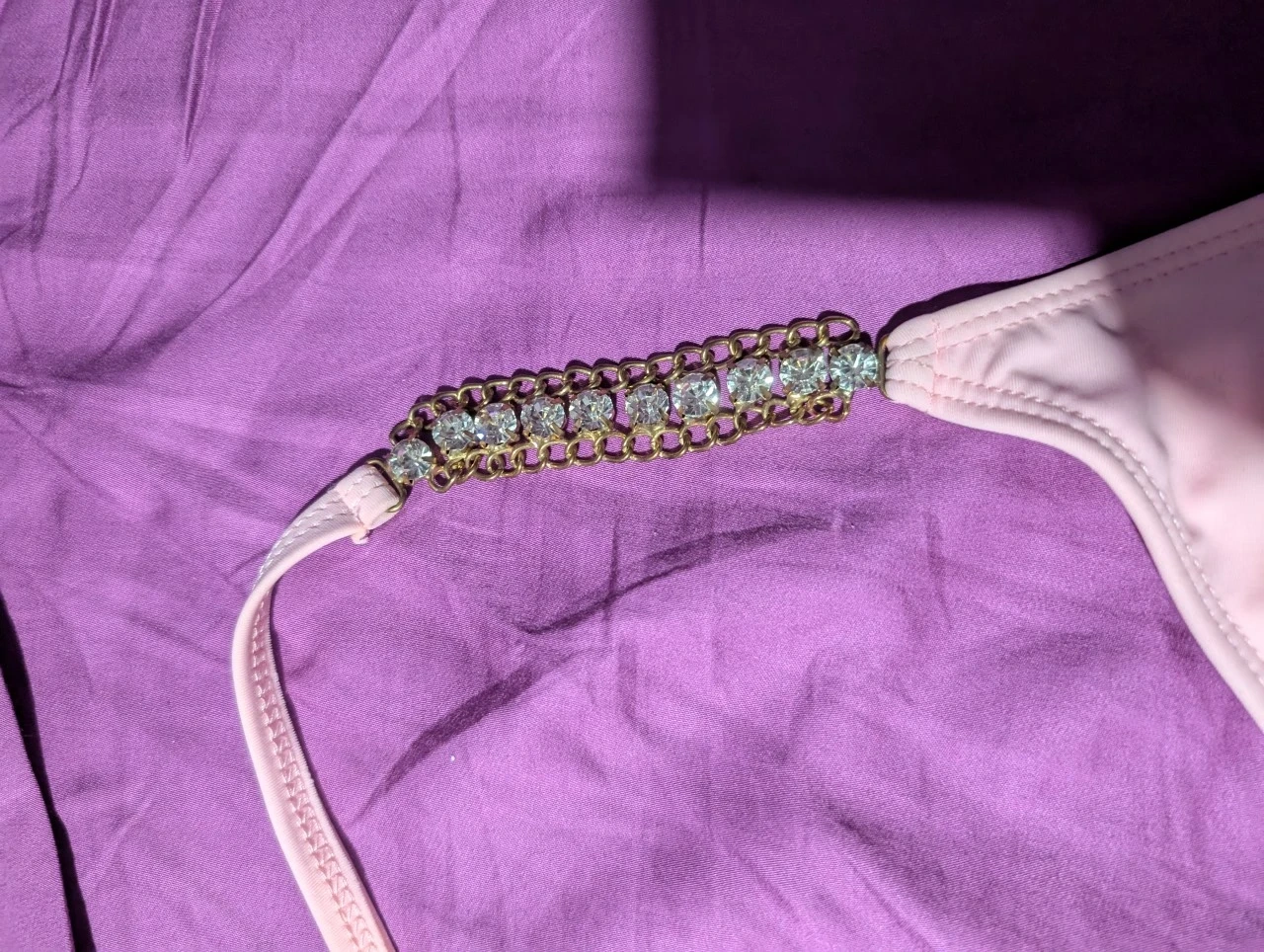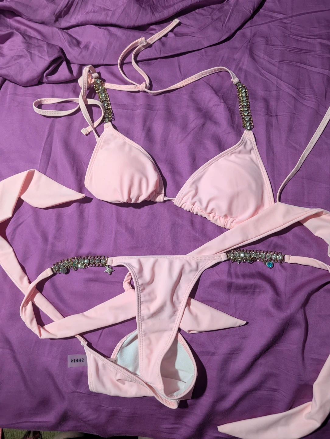65Selling a cute pink bikini set from SHEIN. It has some lovely embellishments on the straps and ties! Barely worn