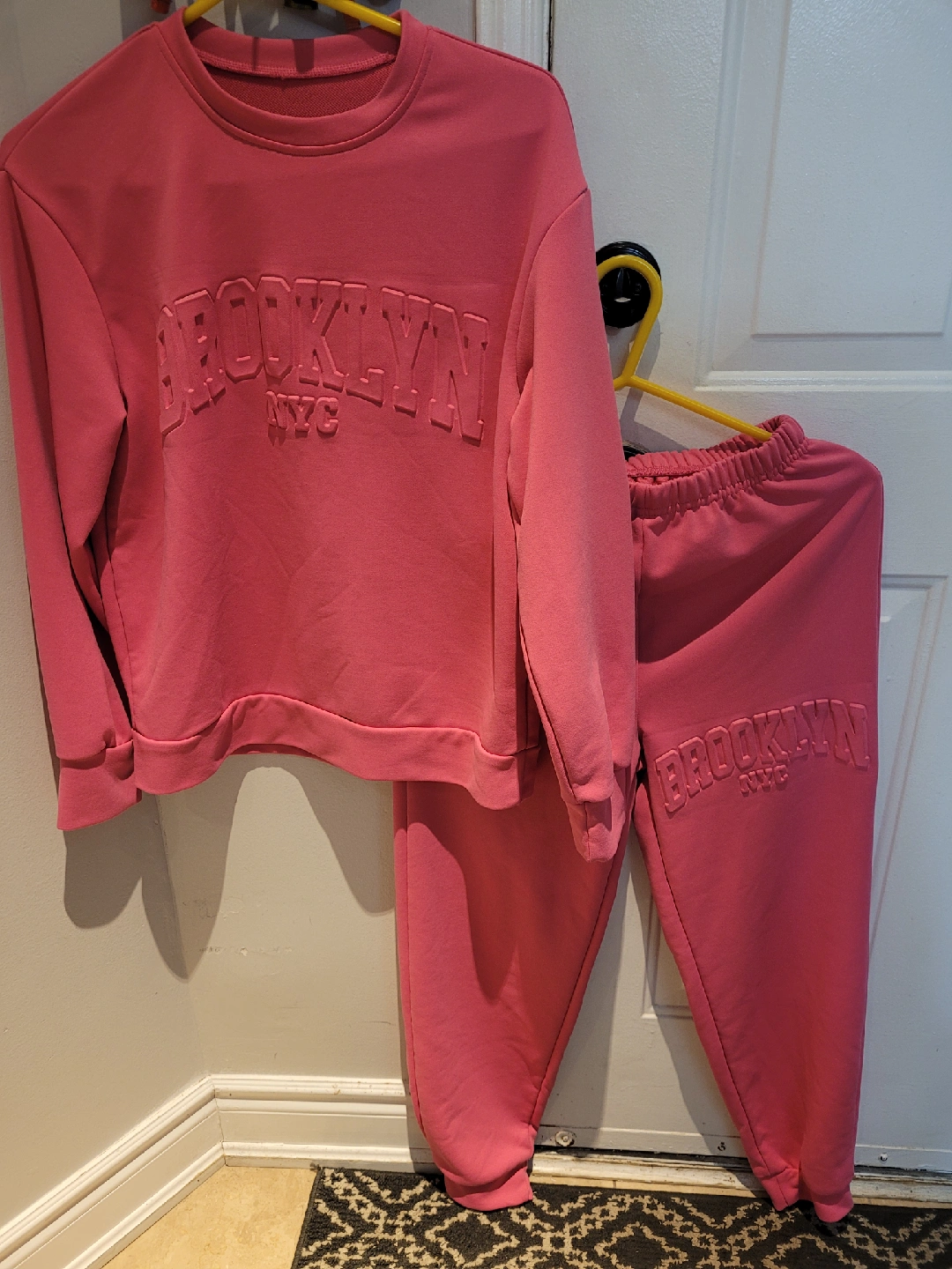 Selling a cute pink sweatsuit from Shein, size 14Y (teen size). The set includes a sweatshirt and matching sweatpants, both with 'BROOKLYN NYC' embossed on the front. Perfect for lounging or casual wear!