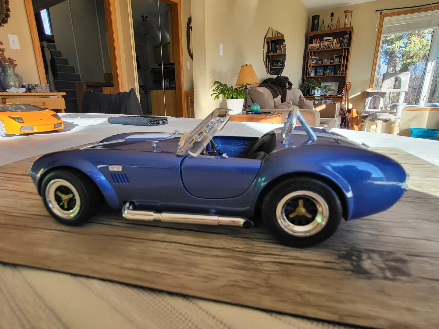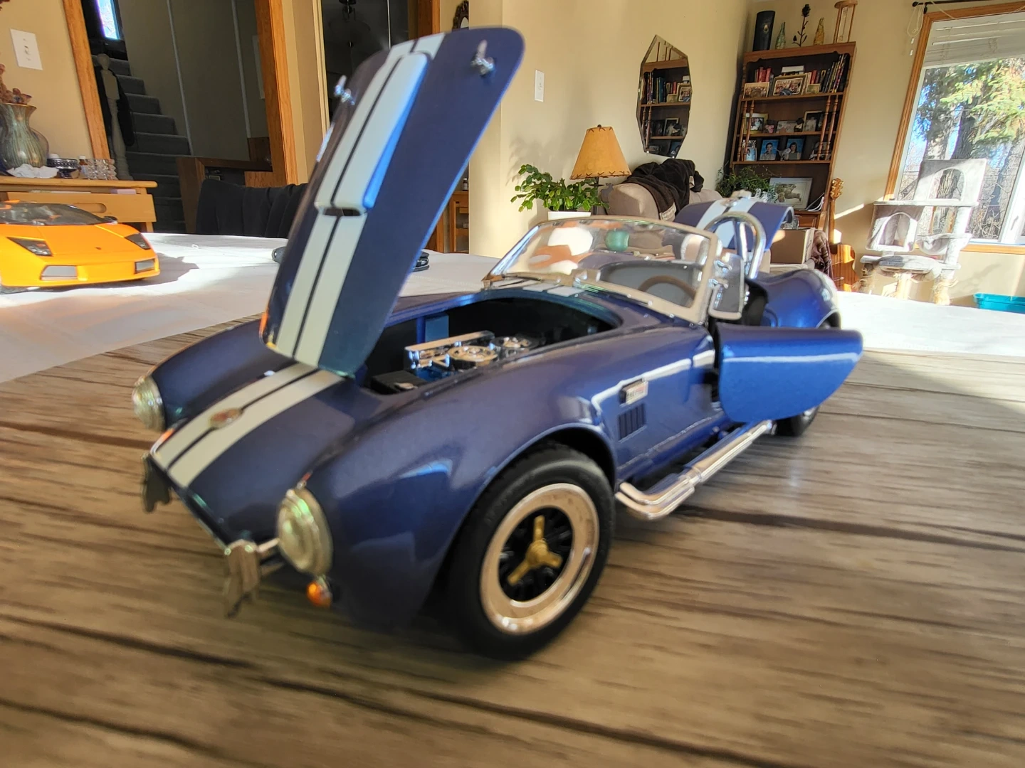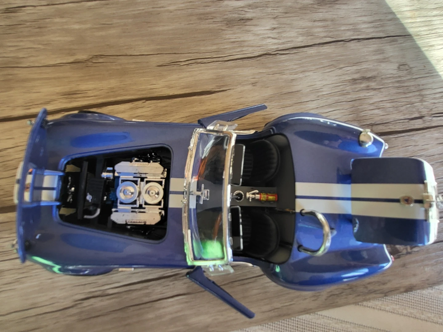 134Selling a blue Shelby Cobra 427 diecast model car. It's in great shape and would be a cool addition to any collection! The details are pretty neat, especially the engine and interior. Slight slant to windshield.