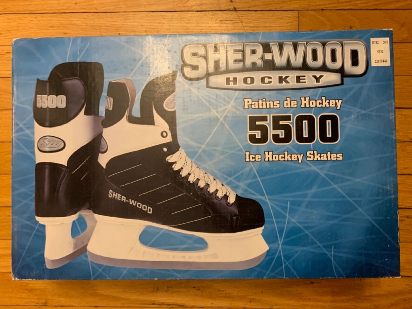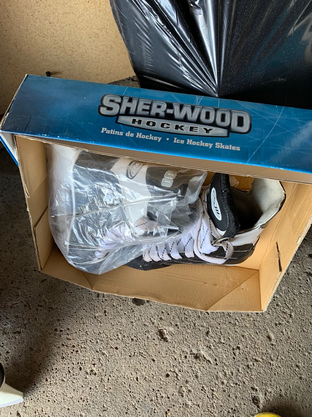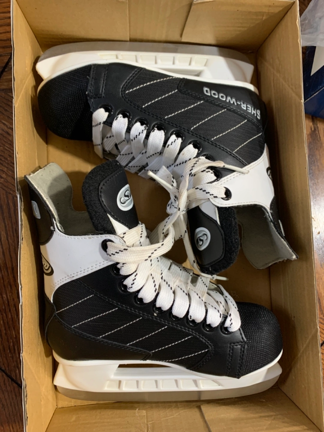 72Black and white ice hockey skates. Size Jr. 2. In original box. Blades are absolutely clean and shiny without any rust or damages Available only for pickup Final price