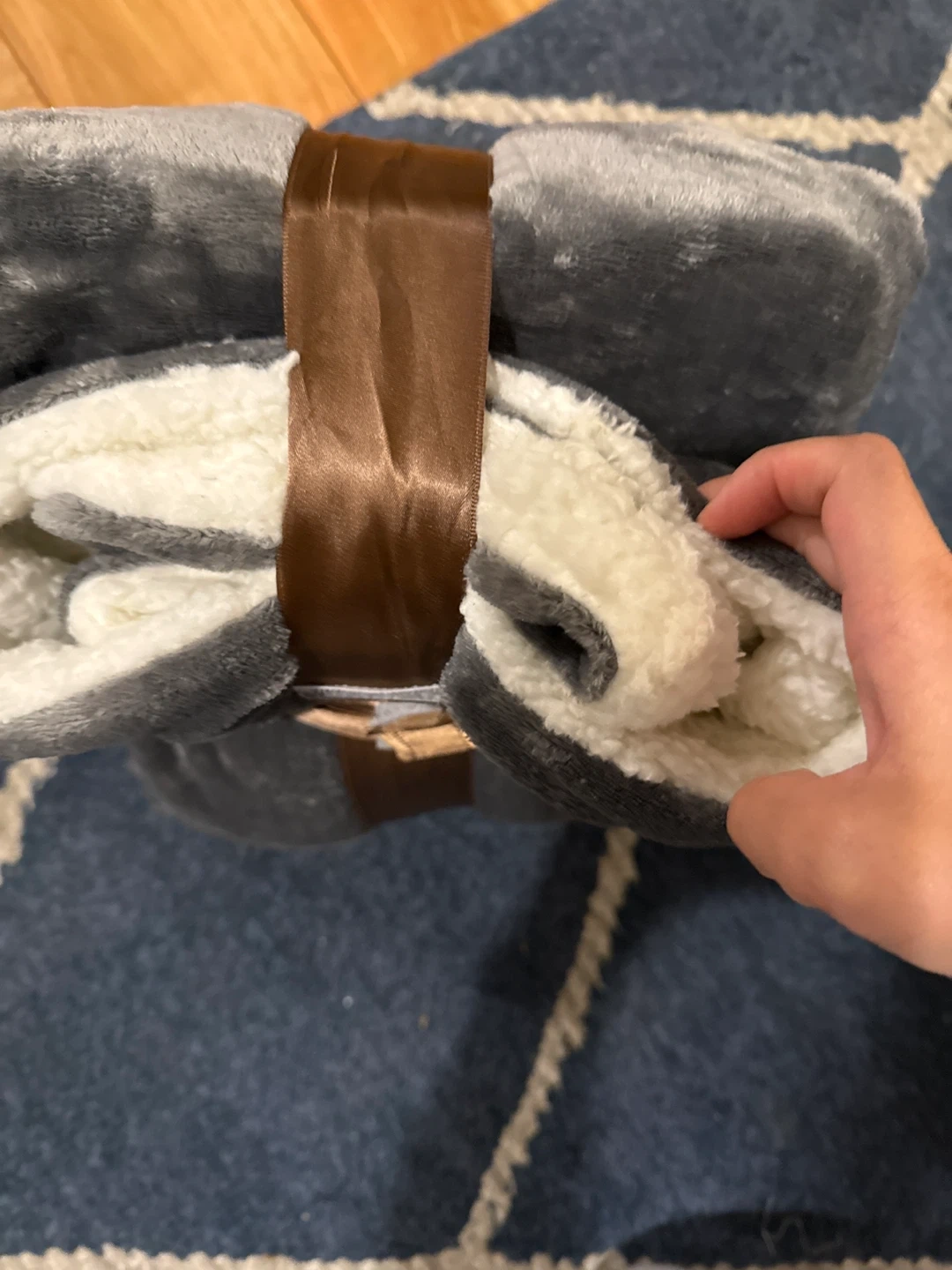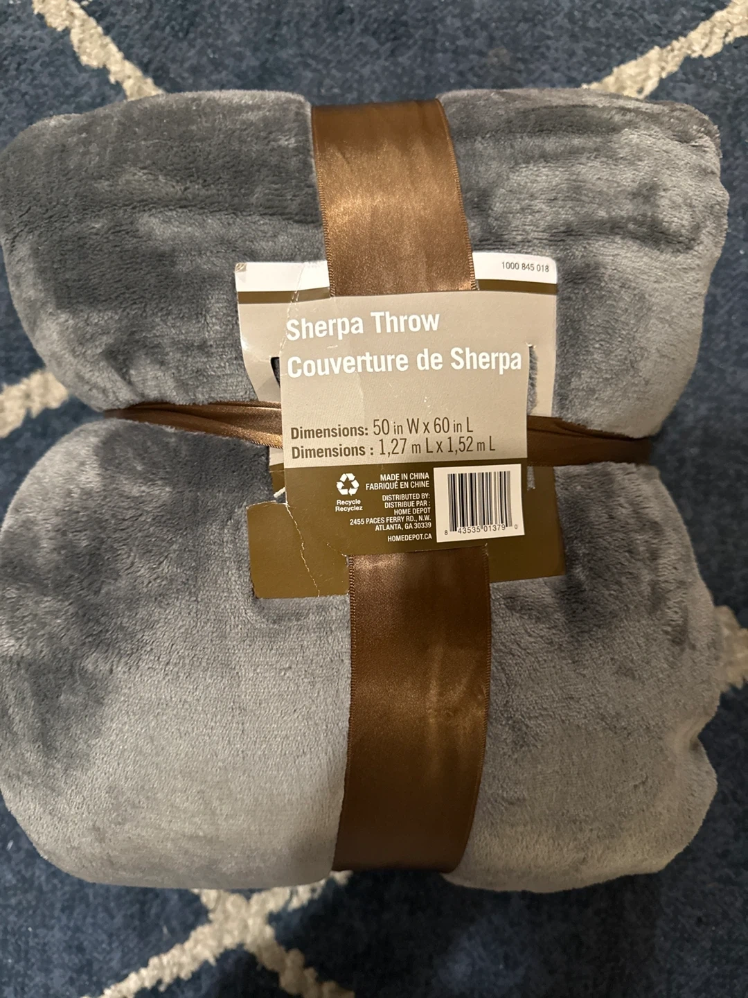 65Cozy Sherpa throw blanket, still in its original packaging! It measures 50 inches by 60 inches (1.27 m x 1.52 m). The blanket is a lovely grey colour and feels super soft to the touch. Perfect for snuggling up on the couch during these chilly evenings