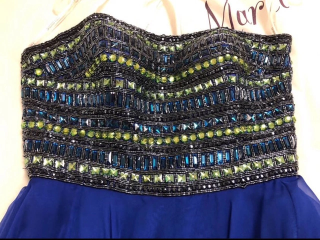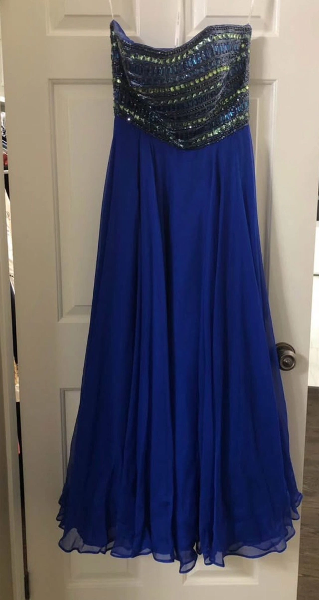 15Make a statement at your next special occasion with this Sherri Hill dress, a stunning strapless gown in a vibrant royal blue. The dress features an intricately beaded bodice that catches the light beautifully, flowing into a chiffon skirt. Additional Details: * Worn 1-time * Great condition * Brand: Sherri Hill * Size: Medium (8-10) * Colour: Royal Blue * Style: Strapless, beaded bodice with chiffon skirt