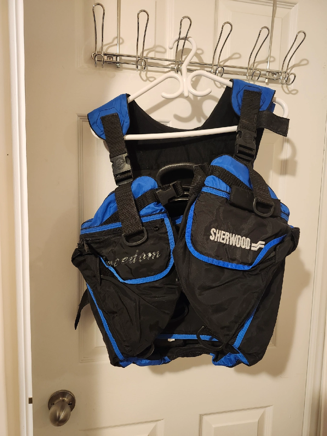 25Selling a Sherwood scuba diving BCD vest in good condition! It's black with blue accents and has adjustable straps for a comfortable fit. Perfect for your next underwater adventure