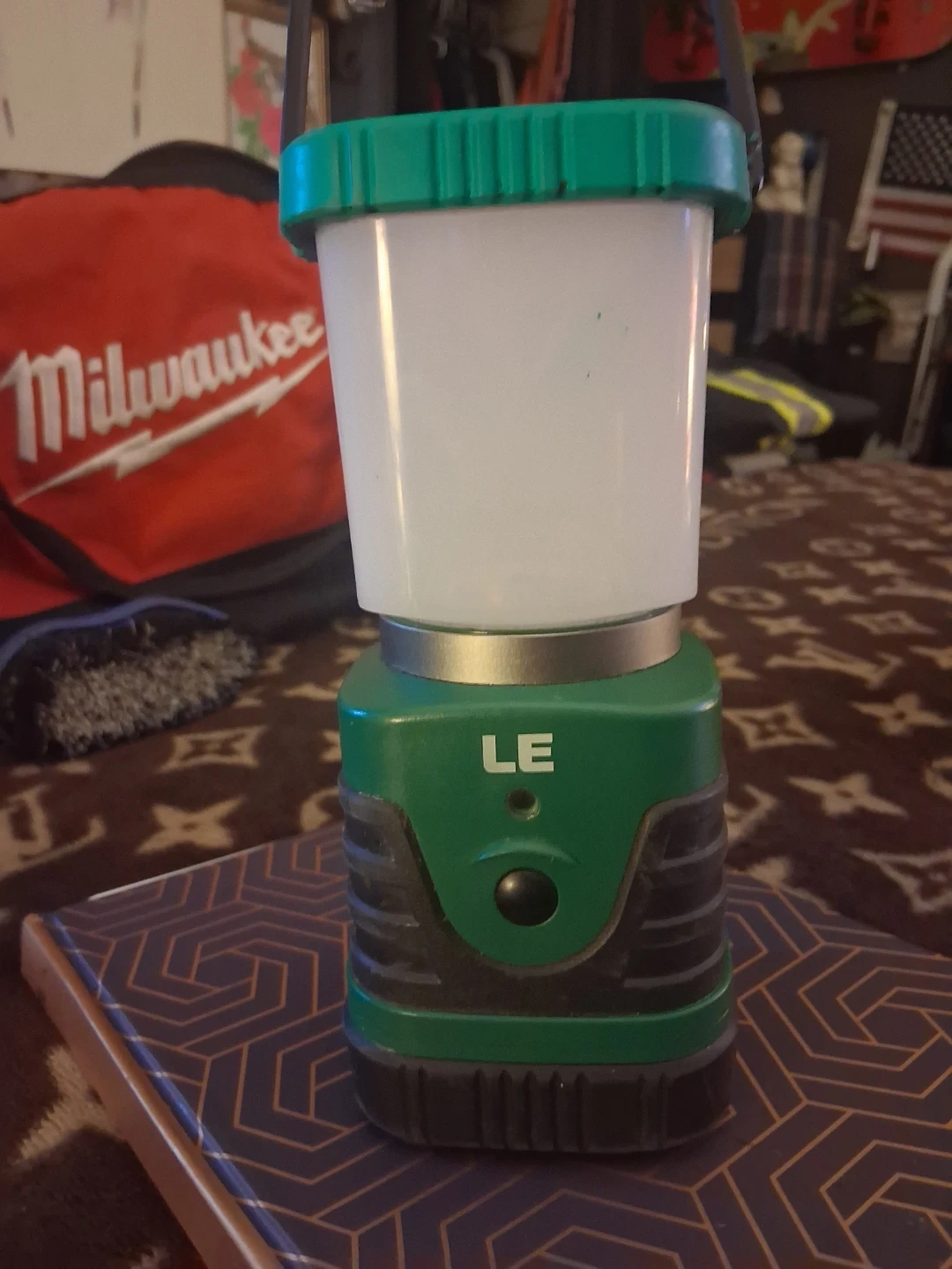 LE LED camping lantern, perfect for outdoor adventures or power outages. It's green and white, made of durable plastic. Battery operated for portable lighting.