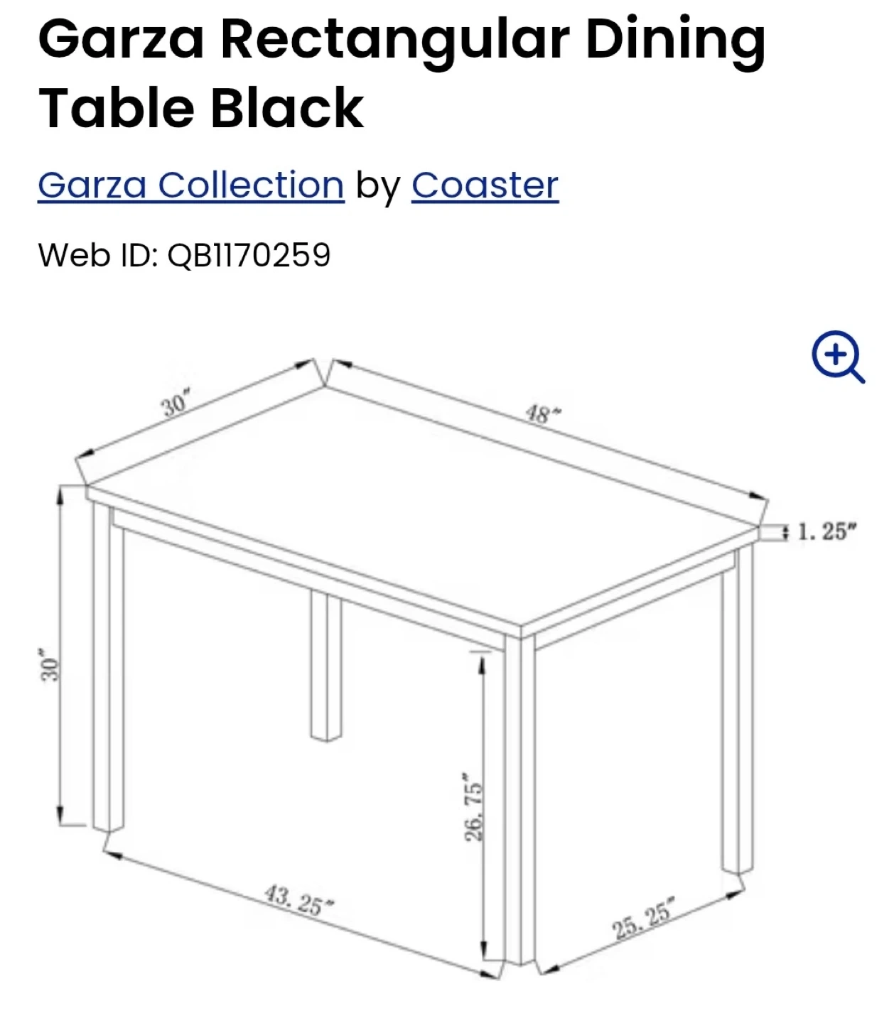 This Garza dining table offers a stylish, modern look. Its rectangular shape and black finish make it a versatile addition to any dining space. 48" L x 30" W x 30" H.