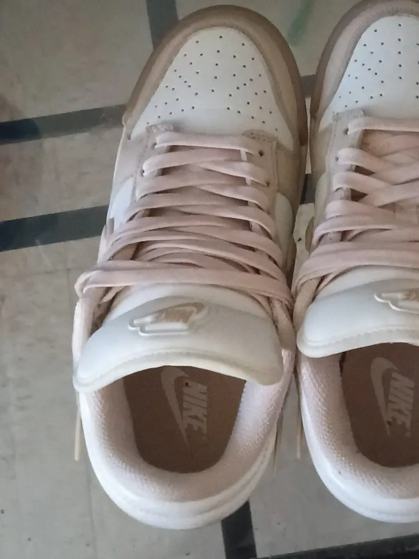 These are Nike low top sneakers in a pink and white colorway. They feature lace-up closure. Uppers are a mix of leather and perforated details. The Nike logo is visible on the insoles.