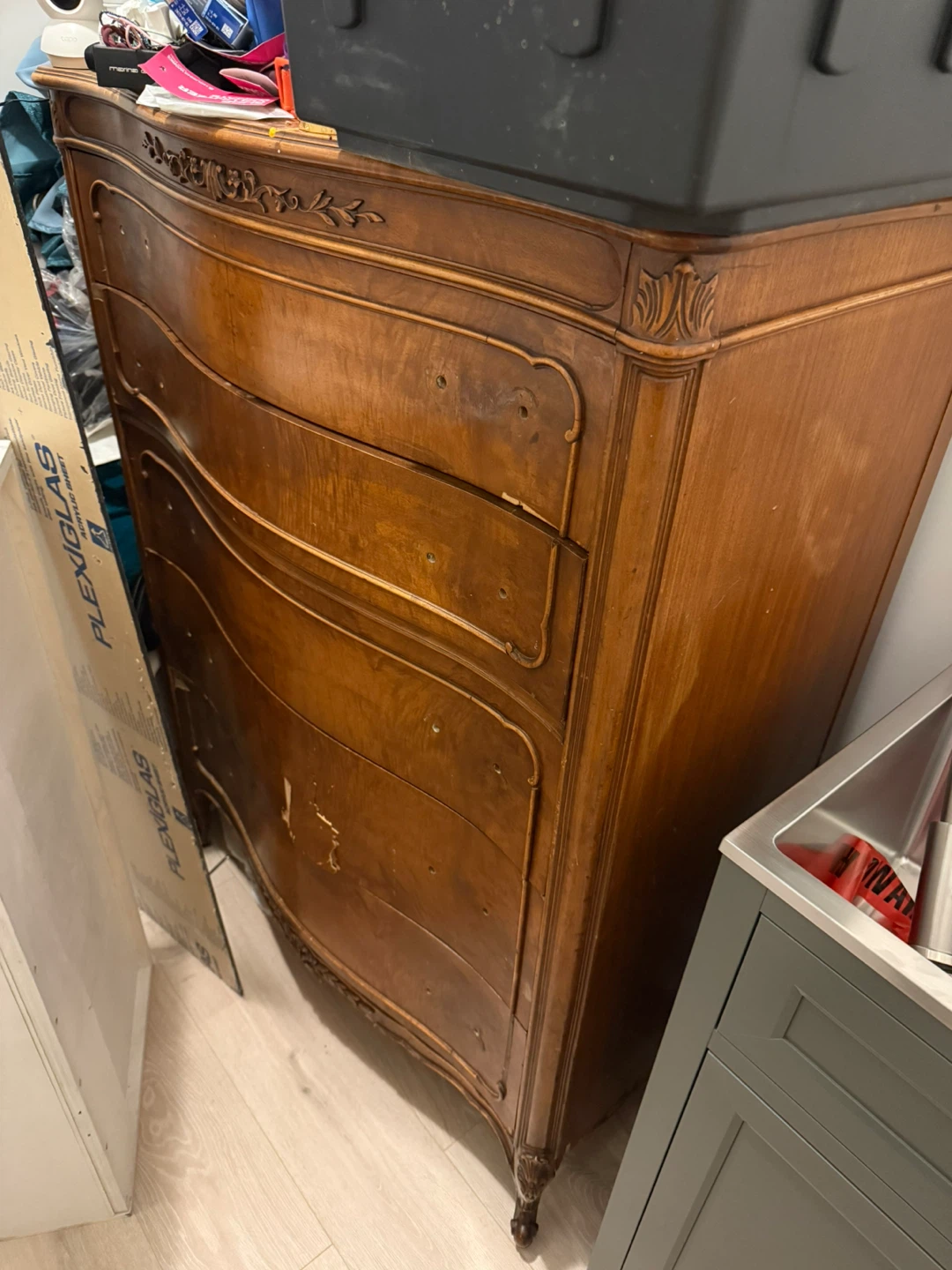 This vintage dresser is by John Stuart Inc. It's made of wood with ornate detailing. It has multiple drawers for storage.