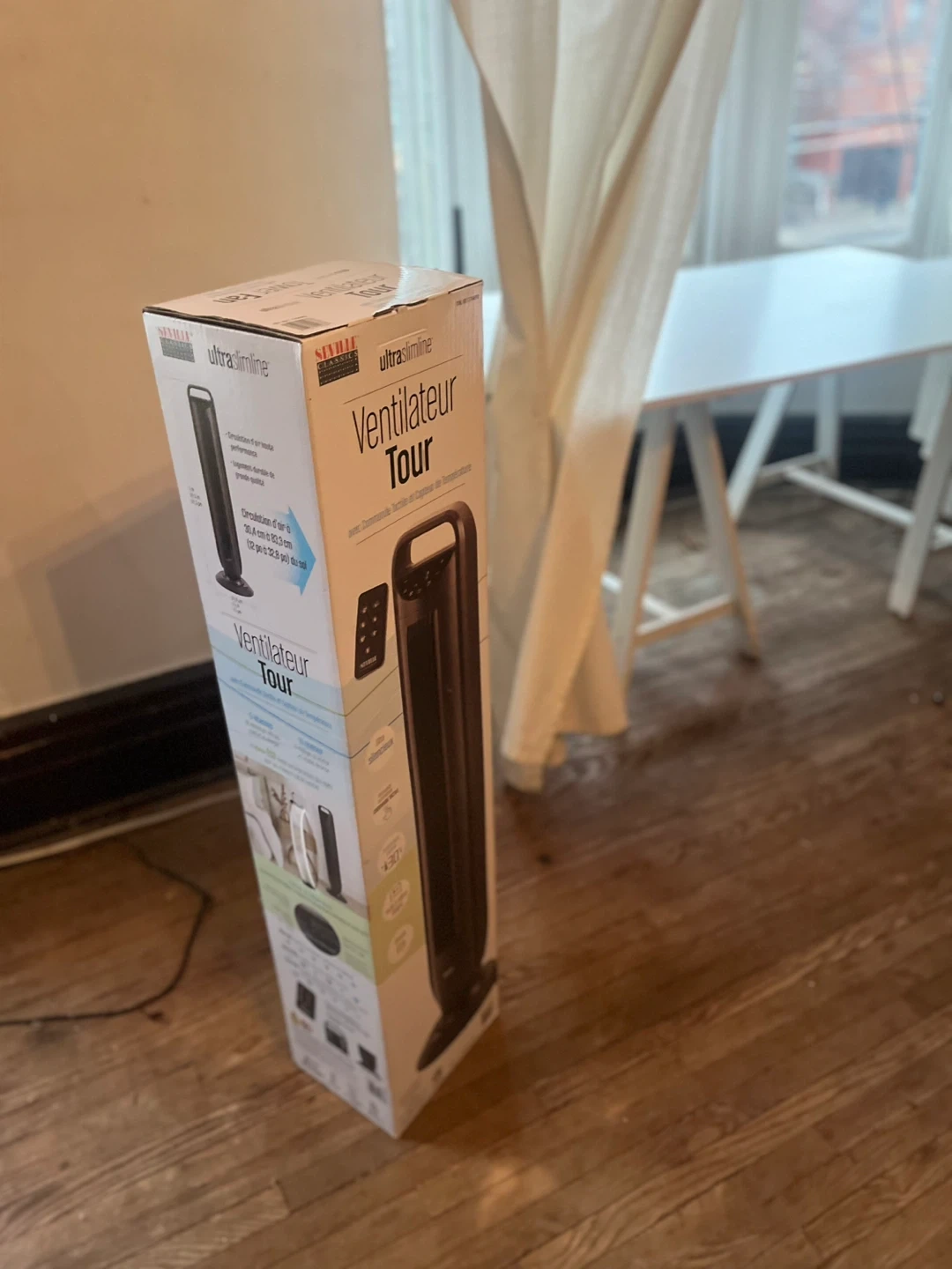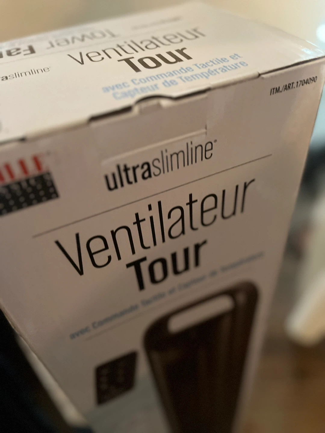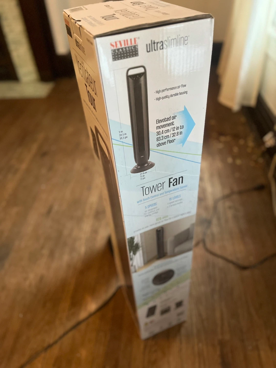 Seville Classics Ultraslimline tower fan in black. It features 5 speeds and a remote control. This fan is 30.4 cm / 12 in tall.