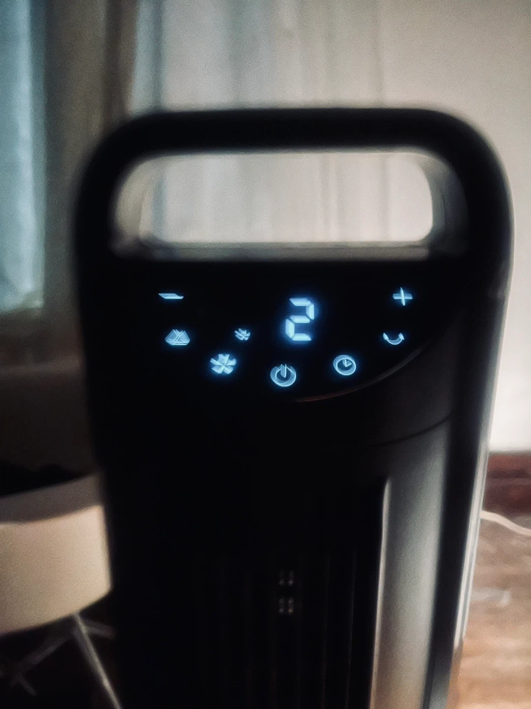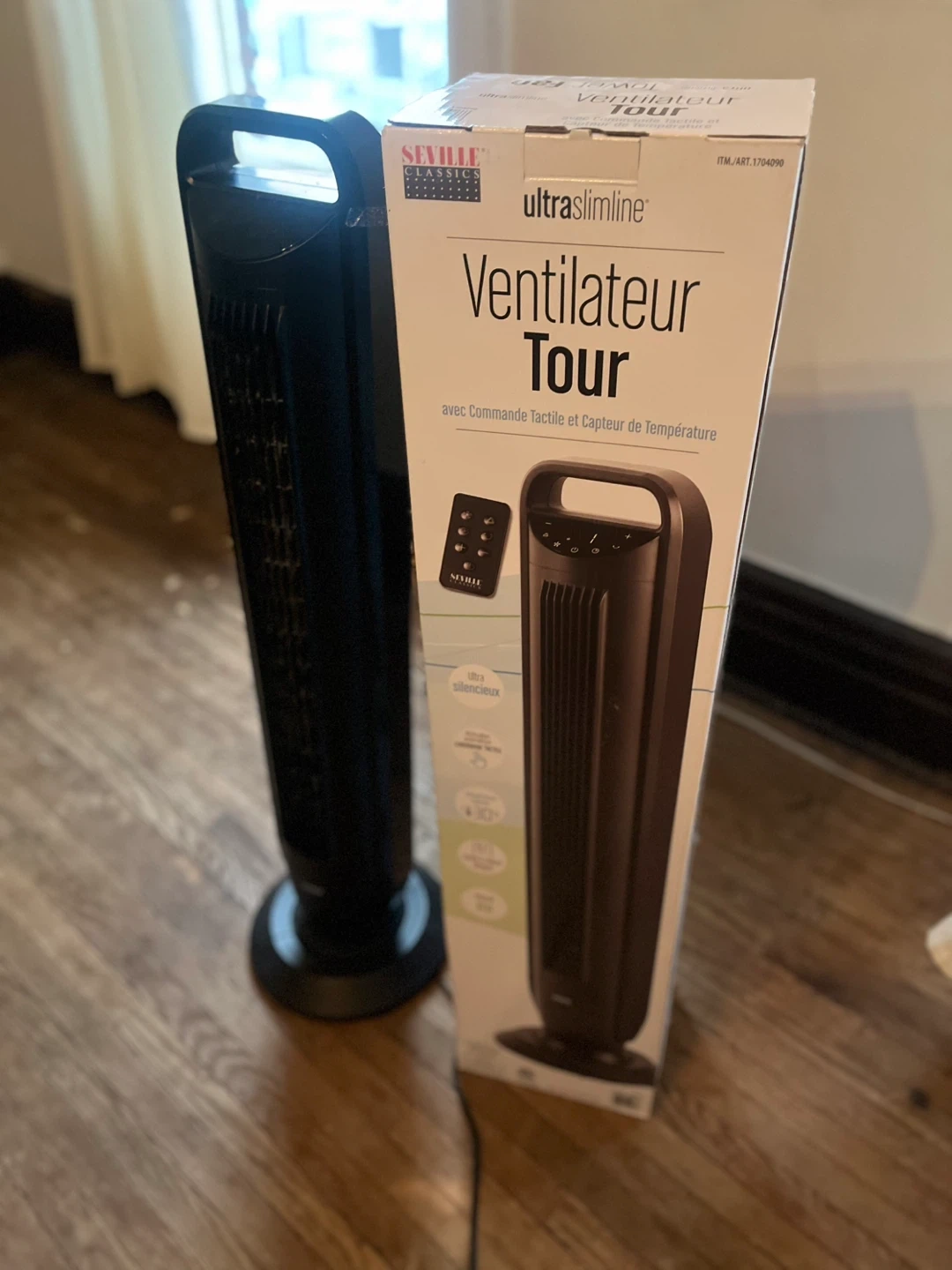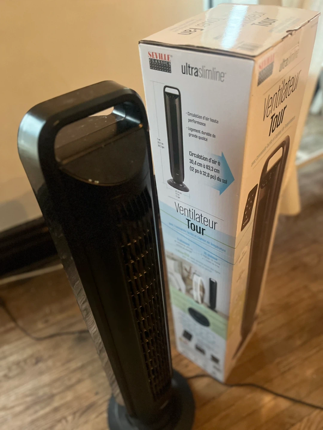 Seville Classics Ultraslimline tower fan in black. It features 5 speeds and a remote control. This fan is 30.4 cm / 12 in tall.
