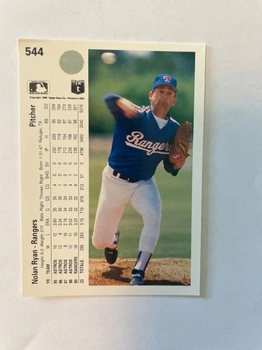 This is a 1990 Upper Deck #544 baseball trading card featuring Hall of Famer Nolan Ryan from the Texas Rangers. It's a sought-after collectible for sports card fans and collectors. This card captures a moment from the 1990 season. Pulled from a pack that was never opened before 7/20/25.