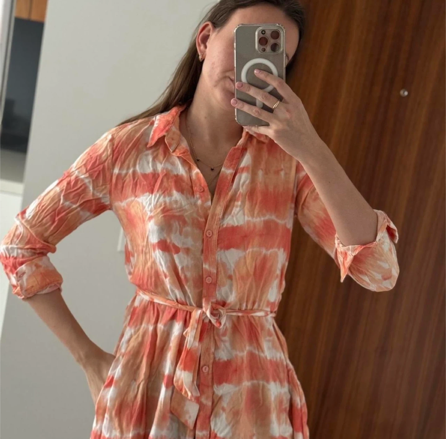 Knee-length, button-down shirt dress with a tie belt at the waist. The dress has rolled-up sleeves and features a tie-dye style pattern in shades of coral orange, white, and a hint of beige. The material looks light and airy, perfect for spring or summer.