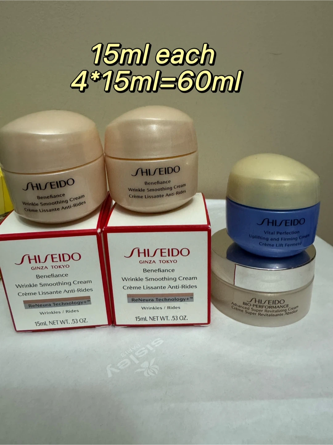 Selling a set of Shiseido creams! Includes Benefiance Wrinkle Smoothing Cream (15ml) and Vital Perfection Uplifting and Firming Cream. Perfect for anyone looking to try these high-end skincare products! 15ml each . 4 together for 60ml Price is firm .