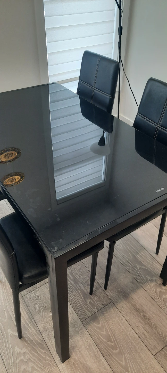 Selling a sleek black dining table set that includes four matching chairs. The table features a glass top, adding a touch of modern elegance to any dining space. The chairs are upholstered in black, providing comfort and style. Perfect for small to medium-sized dining areas!