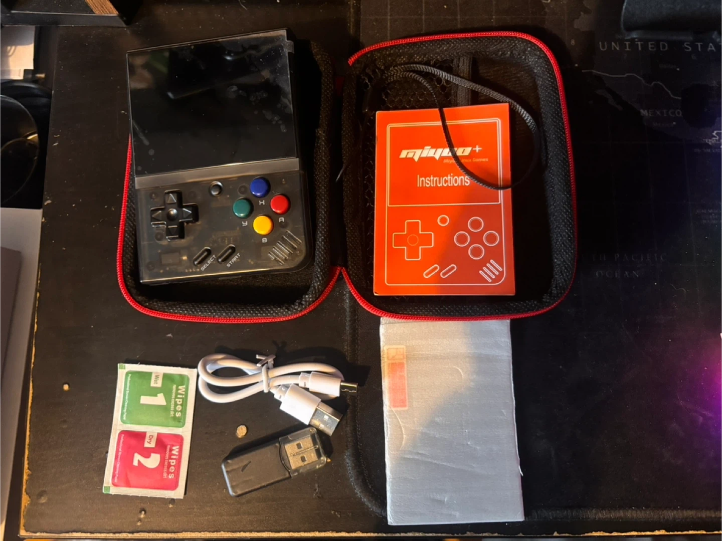 Selling a black Miyoo Mini Plus handheld gaming console! It comes with case, instructions, and all included components like the charger. It's in excellent condition and ready to enjoy some retro gaming on the go