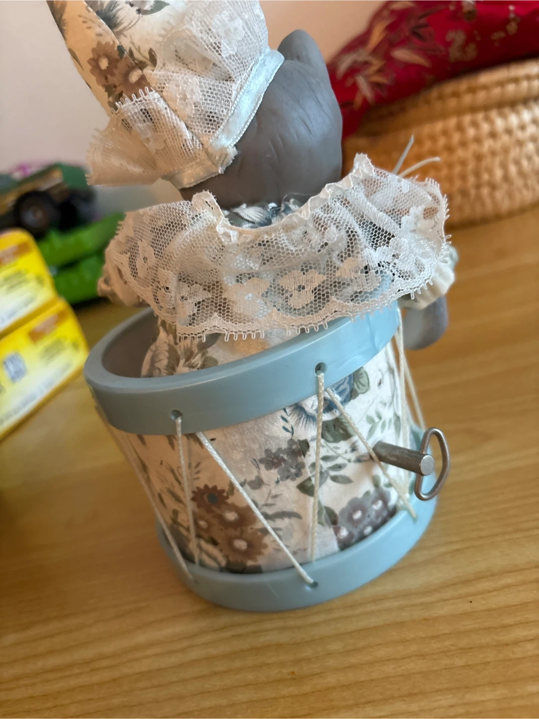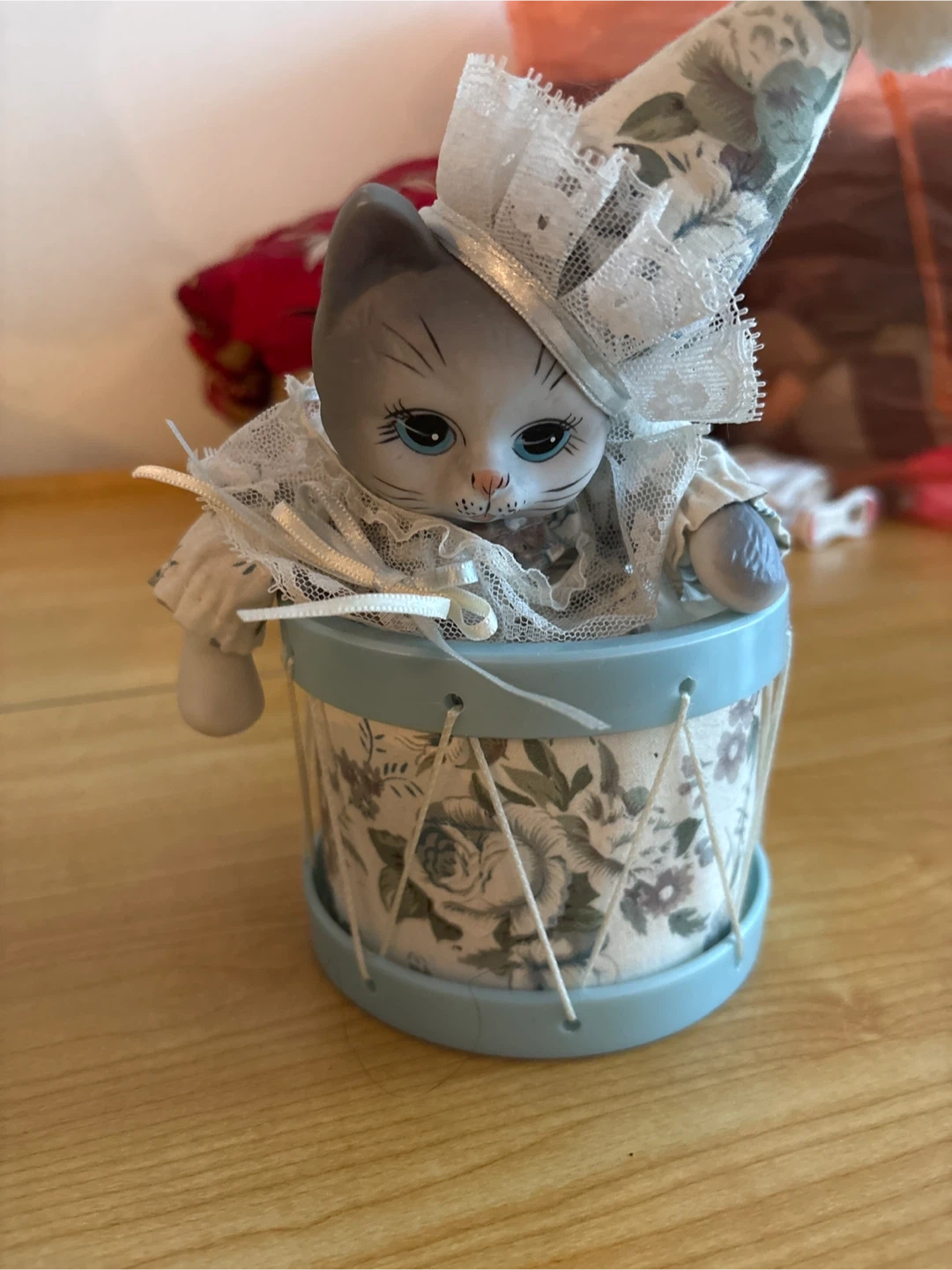 This charming figurine features a porcelain cat dressed in lace and a hat, sitting inside a decorative drum. It has a wind-up mechanism on the side, suggesting it's a musical item. The drum is adorned with a floral pattern. It's a lovely decorative piece for any cat lover's collection.