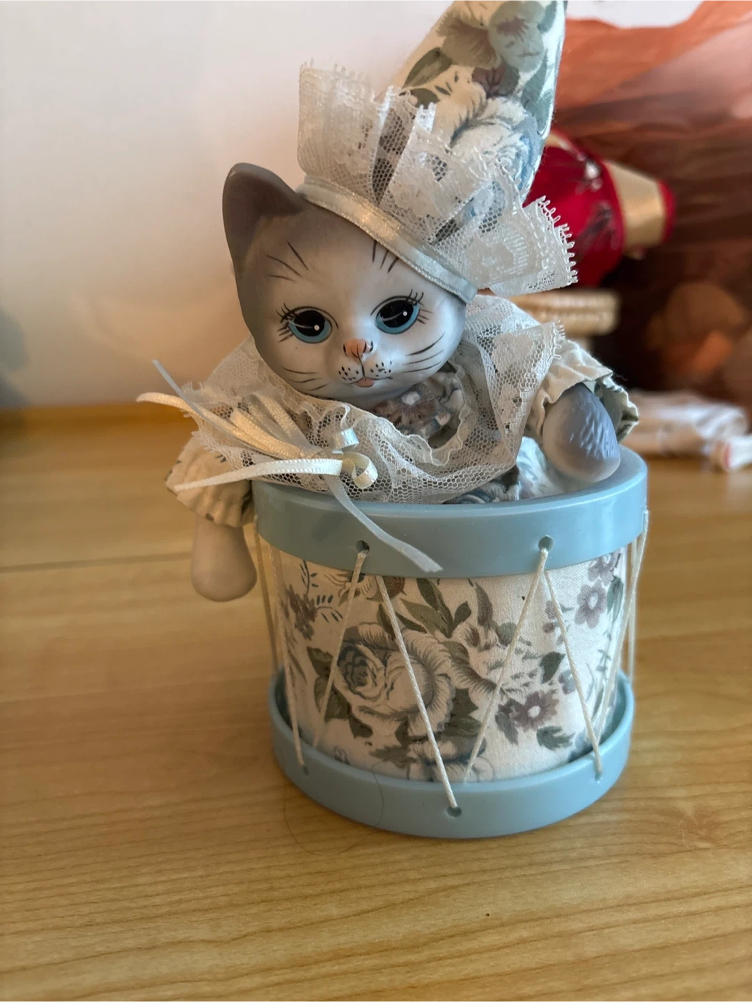 This charming figurine features a porcelain cat dressed in lace and a hat, sitting inside a decorative drum. It has a wind-up mechanism on the side, suggesting it's a musical item. The drum is adorned with a floral pattern. It's a lovely decorative piece for any cat lover's collection.