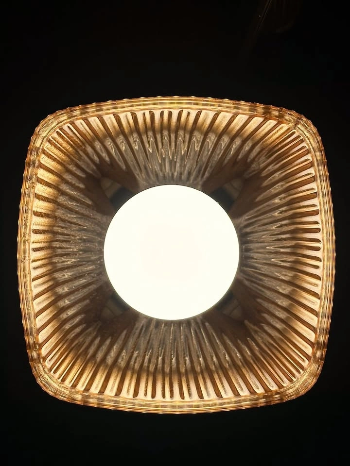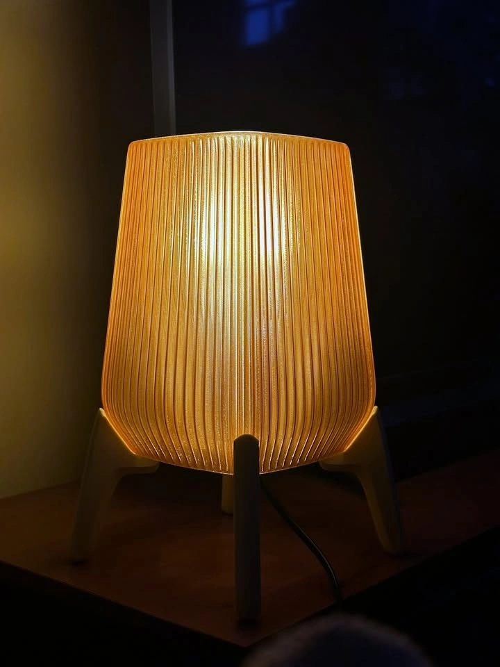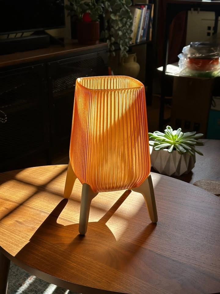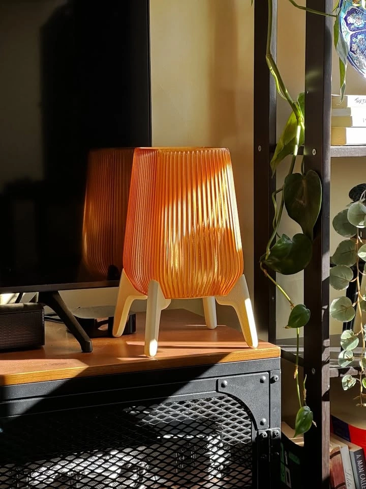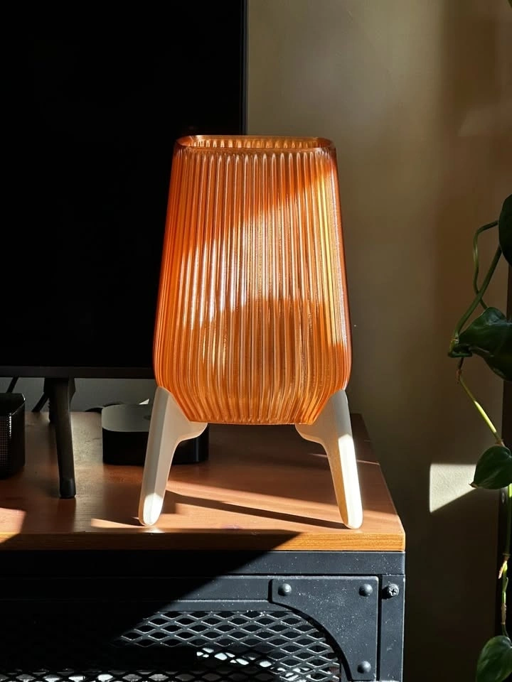 This piece is a nod to mid-century modern design with a warm, architectural feel. It features a light brown fluted shade that puts off a cozy, honey-like amber glow, perfect for a bedside table or as a mood light in a living room corner.