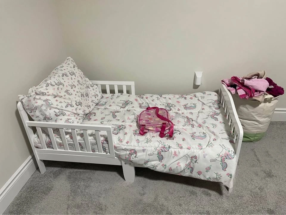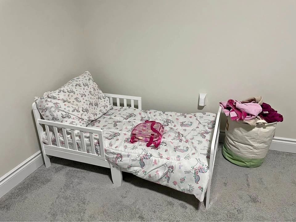Clean, sturdy, and perfect size for a toddler or young child. White frame with low height for safety. Comes with mattress and cute bedding (optional). Condition: Very good, barely used. No issues, no damage. Just need it gone ASAP. Pickup only. Mayfield and McLaughlin.