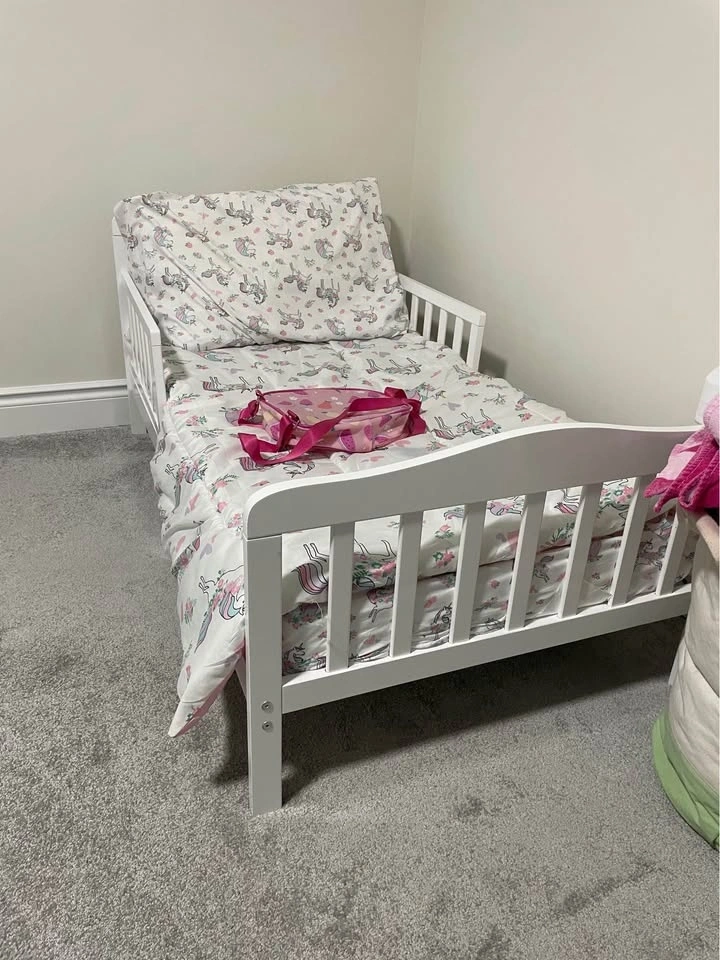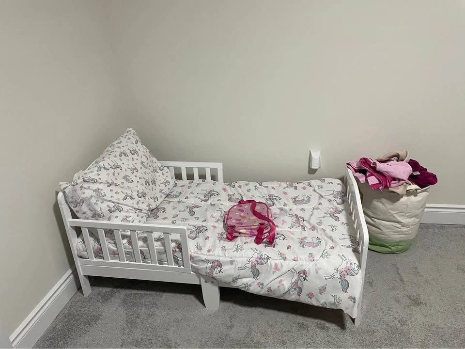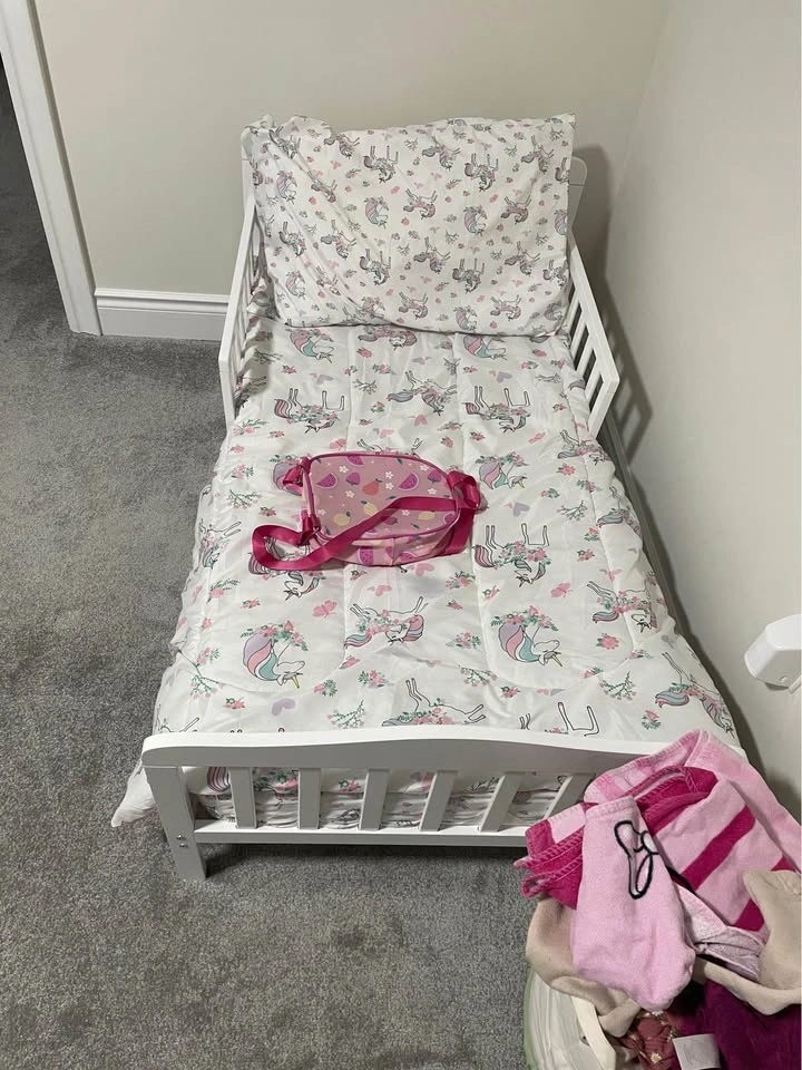 Clean, sturdy, and perfect size for a toddler or young child. White frame with low height for safety. Comes with mattress and cute bedding (optional). Condition: Very good, barely used. No issues, no damage. Just need it gone ASAP. Pickup only. Mayfield and McLaughlin.