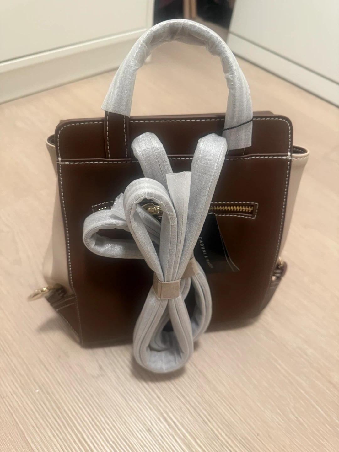 I'm selling a brand new Caduni Kaiser backpack! It's a stylish white and brown colour, made with cow split leather and synthetic leather.