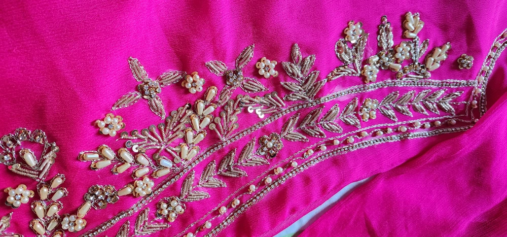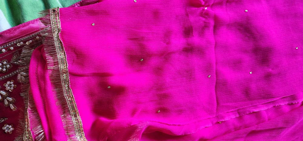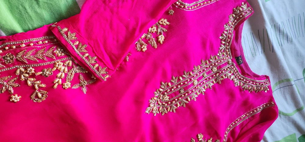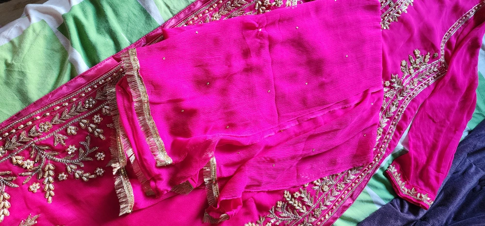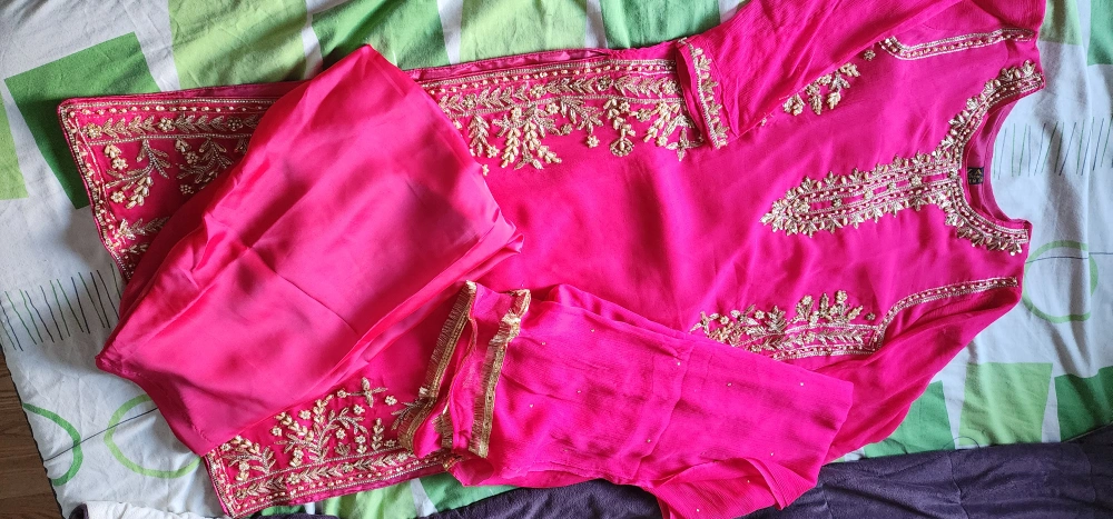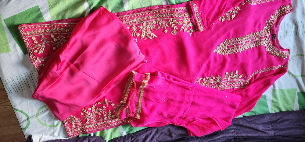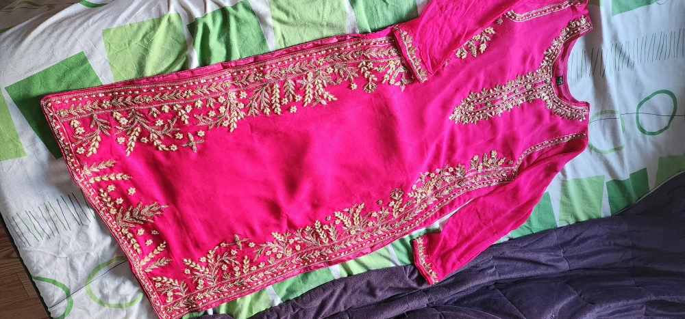 34Stunning Pakistani shalwar kameez set in a vibrant shocking pink color, beautifully detailed with gold gota and thread embroidery on the front, sleeves, and borders. Comes with a matching dupatta featuring delicate embellishments that complete the elegant look. Size: Medium Color: Shocking Pink Includes: Kameez + Shalwar + Dupatta Condition: Brand new Fabric: Soft and flowy, ideal for festive or formal wear πΈ Highlights: Gorgeous gota and zari embroidery throughout Matching dupatta with gold border detailing Perfect for Eid, weddings, parties, and cultural occasions π° Price: $110 π Pickup/Delivery: Local pickup available or delivery available at additional cost.