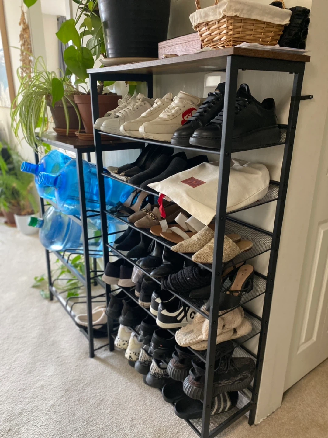 36Selling a shoe rack shelf with a black metal frame! It's perfect for organizing your footwear and keeping your entryway tidy. It seems to be in great condition and can hold a variety of shoe sizes and styles. A practical addition to any home! Minor wear and tear on shelf