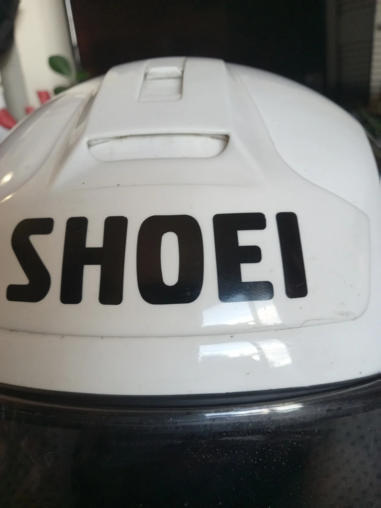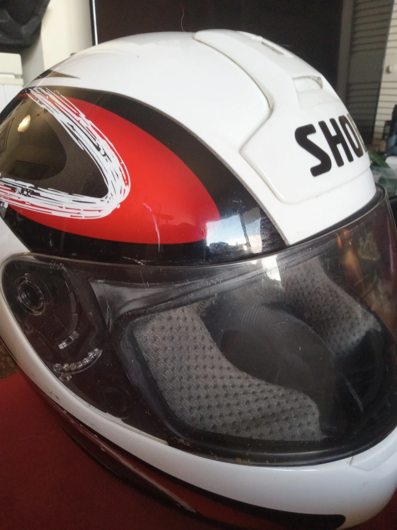Selling a Shoei motorcycle helmet. It has a white base with red and black accents. The helmet is DOT shell approved, and the helmet is made in Japan, with the shield made in the USA. It's in good used condition and ready for a new rider